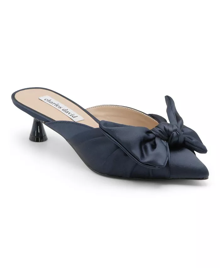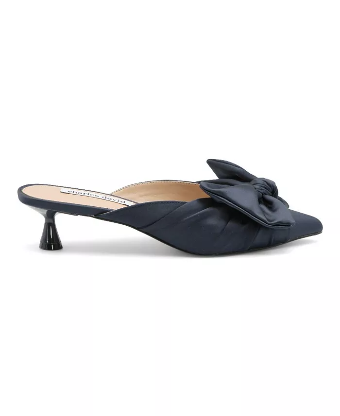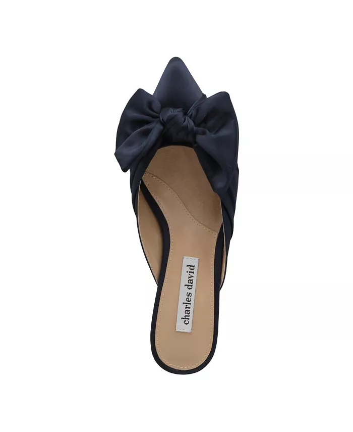 Миндалевидный носок и низкий расклешенный каблук подчеркивают стиль элегантных мюлей, украшенных бантом.