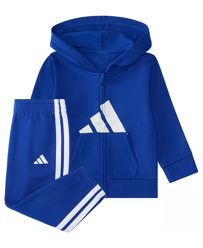Оденьте его с комфортом и стилем в этот комплект из двух предметов от adidas. Куртка с капюшоном и брюки-джоггеры с эластичным поясом дополнены вышитыми логотипами и классическими тремя полосками, которые создают классический спортивный образ.