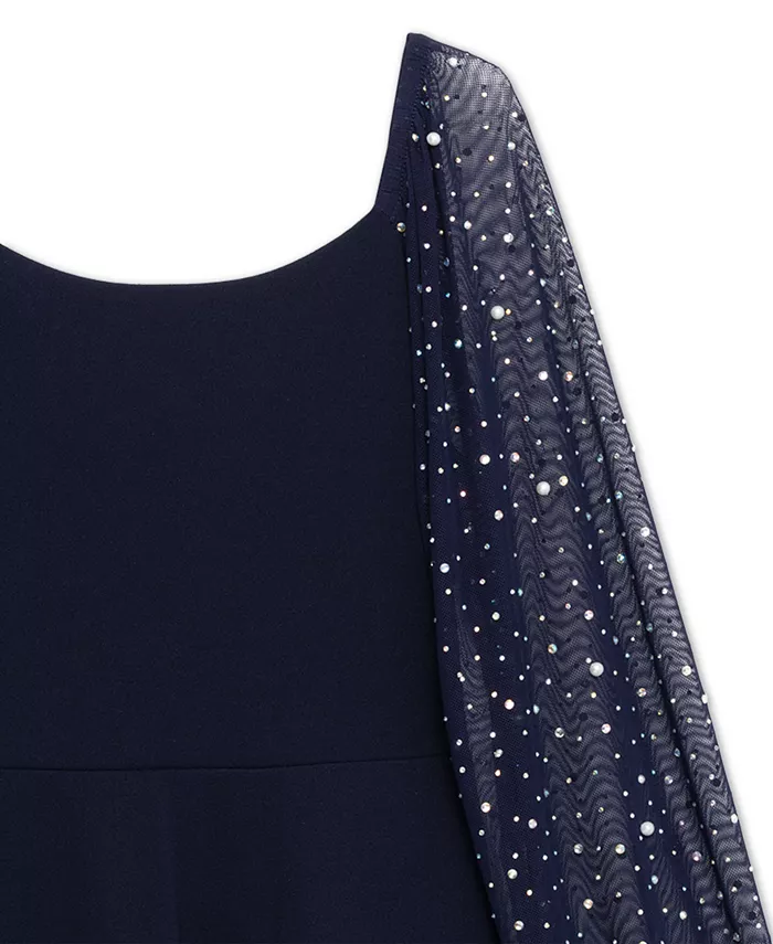Оставьте их без слов! Это ослепительное платье с классическим круглым вырезом и длиной до колена насыщенного темно-синего оттенка идеально подходит для любого особого случая. Длинные прозрачные рукава украшены нежным жемчугом и мерцающими стразами, добавляя каждому движению немного блеска и волшебства. Кружится ли она на свадьбе, освещает праздничную вечеринку или позирует для фотографий, это платье привнесет элегантность, очарование и капельку звездной пыли в ее гардероб.