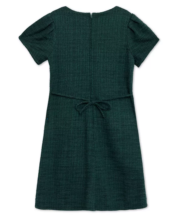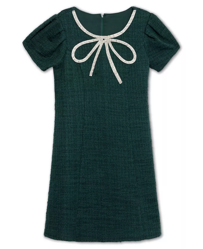 Оставьте их без слов! Это элегантное платье цвета охотничьего зеленого цвета длиной до колена с изящным круглым вырезом, украшенным гигантским бантом, излучает неподвластное времени очарование. Благодаря коротким рукавам и структурированному силуэту, оно идеально подходит для малышек, которые любят классическую изысканность в одежде. Идеально подходит для семейных торжеств, праздников или любого особого случая, сочетая в себе изысканный стиль и легкую причудливость, создавая поистине незабываемый образ.