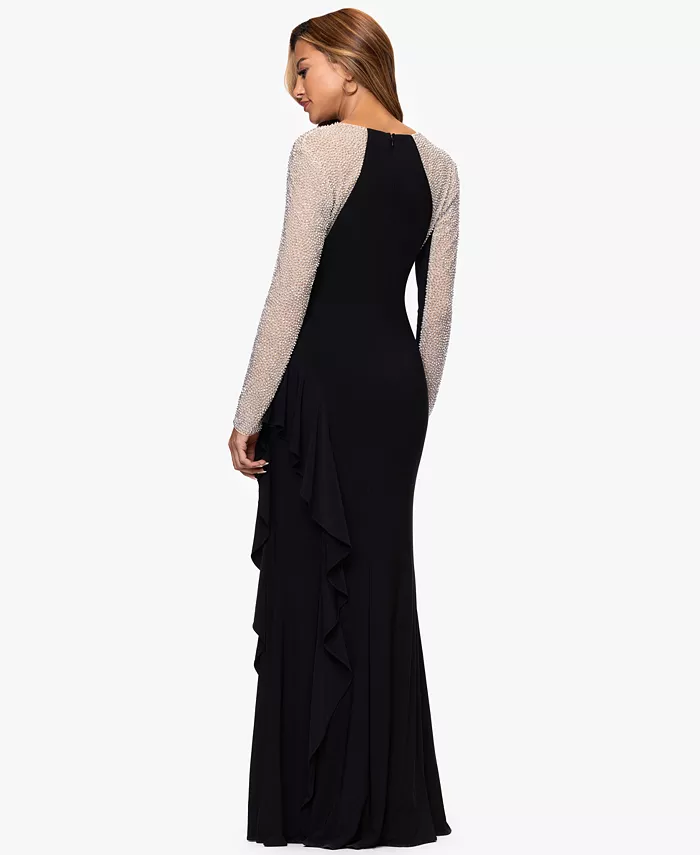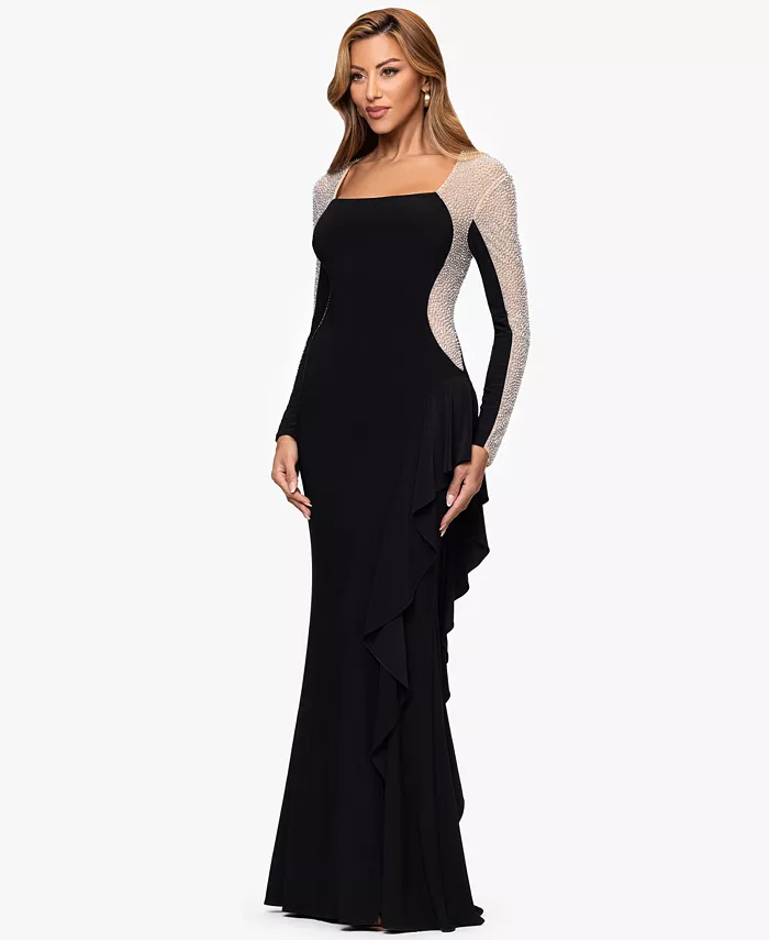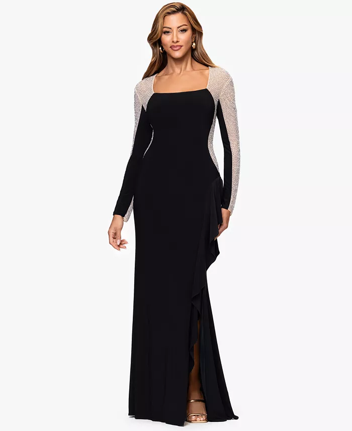 Платье XSCAPE Petite с квадратным вырезом и обтекаемым силуэтом-футляром отличается струящейся изысканностью. Длинные рукава, расшитые бисером, придают элегантность каждому движению, а застежка-молния по центру спины обеспечивает аккуратную посадку по фигуре.