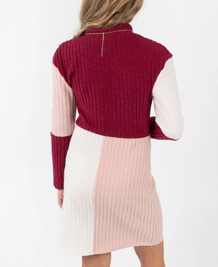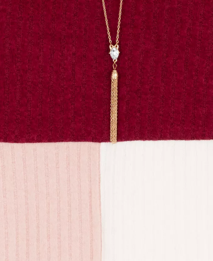 Почувствуйте себя уверенной в себе стильной девчонкой в этом платье-свитере из трикотажного полотна с яркими цветными вставками, дополненном шикарным воротником-стойкой и золотым ожерельем с кисточками для создания повседневного гламура.