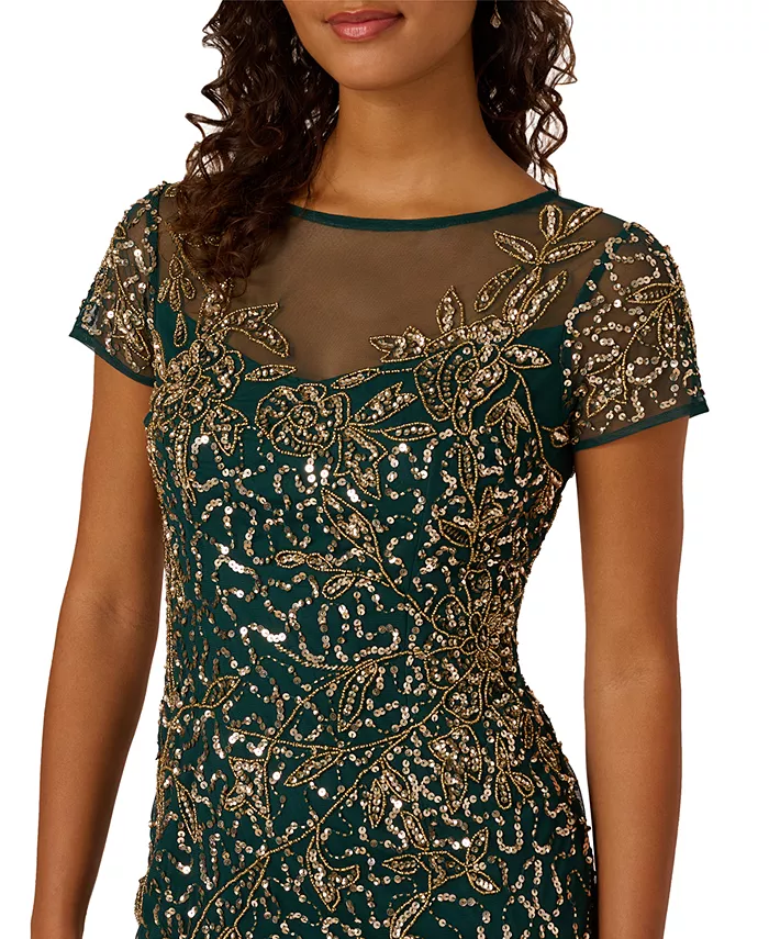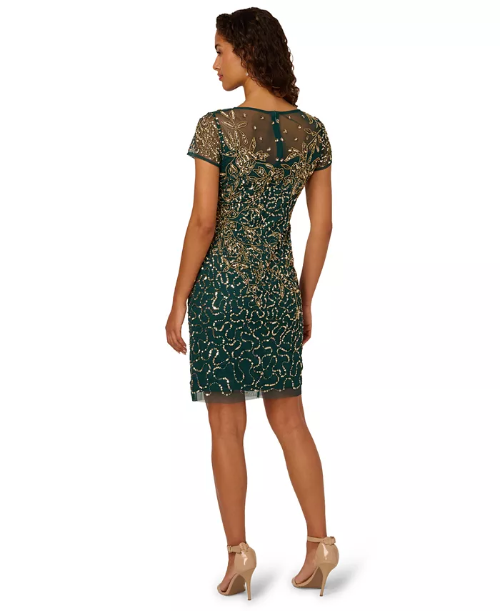 Роскошное сияние отличает очаровательное платье-футляр от Адрианны Папелл, украшенное бисером и пайетками. Принцессовые швы, вытачки на груди и молния сзади создают облегающий силуэт. Это платье с короткими рукавами и вырезом-иллюзорным вырезом идеально подходит для любого мероприятия с коктейльным дресс-кодом, от девичника до свадьбы.