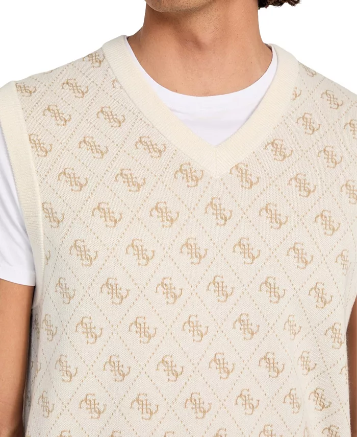 Свитер Horace 4G с жаккардовым узором Quattro G по всей поверхности, без рукавов, V-образным вырезом, стандартной длиной, стандартным кроем, треугольным нашивкой с логотипом Guess на левой стороне груди, ребристой трикотажной отделкой по нижней полосе, V-образным вырезом и проймами.