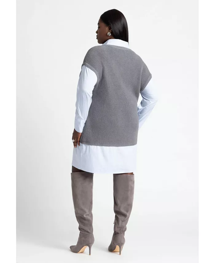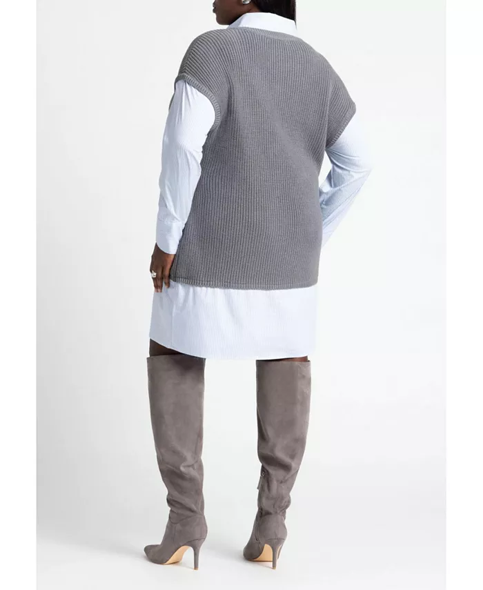 Свитер: 55% хлопок, 45% акрил. Ткань: 70% хлопок, 27% чинлон, 3% спандекс. Свободный крой. Рубашечный воротник. Функциональная планка спереди. Спущенное плечо. Длинный рукав с функциональной манжетой. Длина мини. Длина изделия для размера 18/20 составляет 39 дюймов. Эластичная пряжа для свитера с деталями из поплина. Машинная стирка в холодной воде на щадящем режиме с изделиями похожих цветов. Использовать только отбеливатель без хлора при необходимости. Не сушить в стиральной машине. Сушить в разложенном виде на горизонтальной поверхности. Гладить при низкой температуре при необходимости.