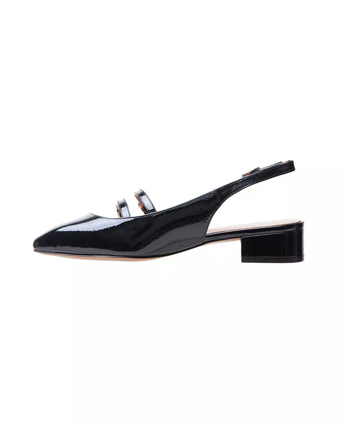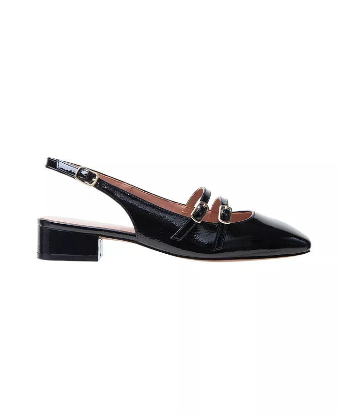 Современные туфли Mary Jane с открытым носком, низким блочным каблуком и двумя ремешками из жатого лакированного материала. Мягкая стелька и нескользящая тисненая резиновая подошва.