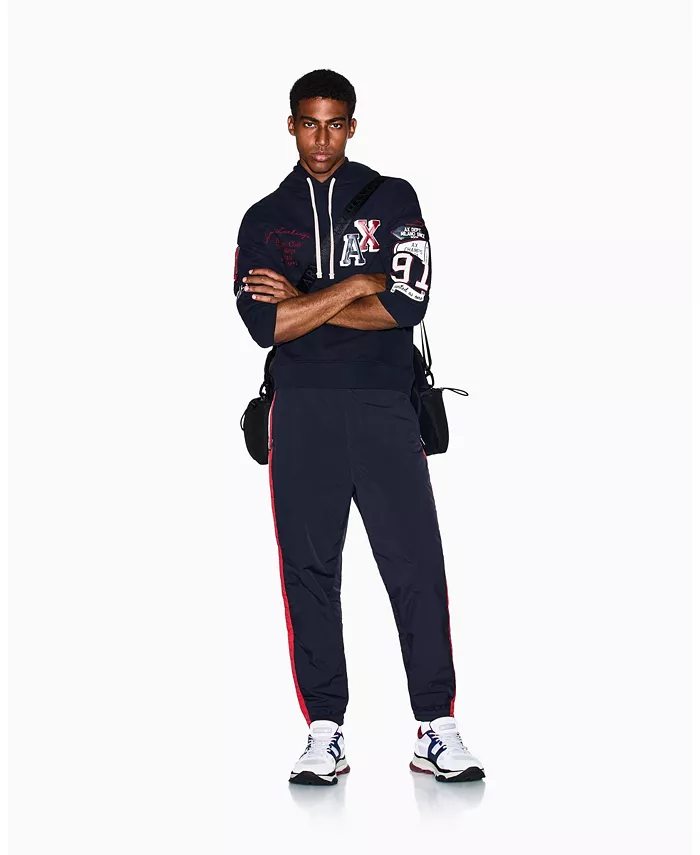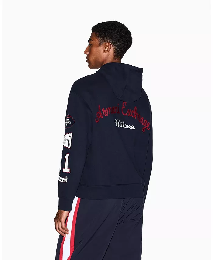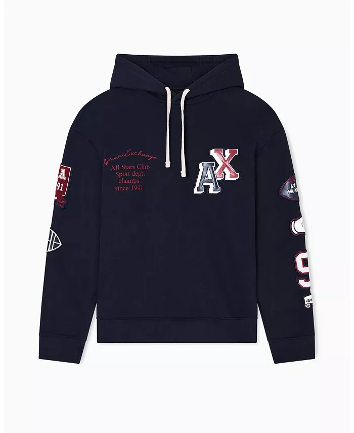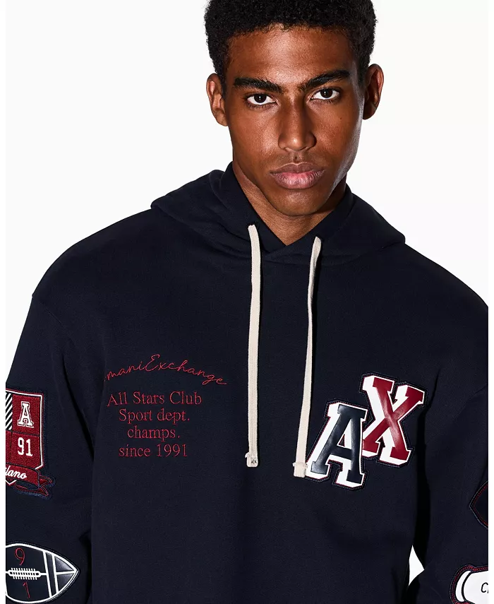 Толстовка цвета глубокой сине-зеленой ткани с вышитыми значками, включая броскую надпись AX и графические нашивки. Свободный крой и капюшон на шнурке идеально подходят для создания яркого уличного стиля.