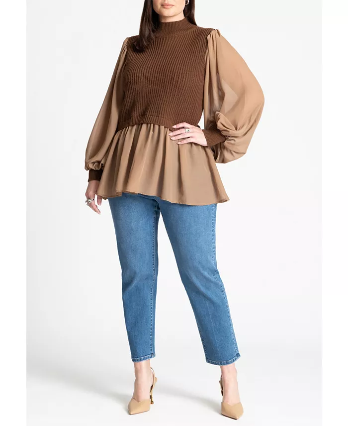 Уютная водолазка в рубчик контрастирует с воздушными шифоновыми рукавами и присборенными манжетами.