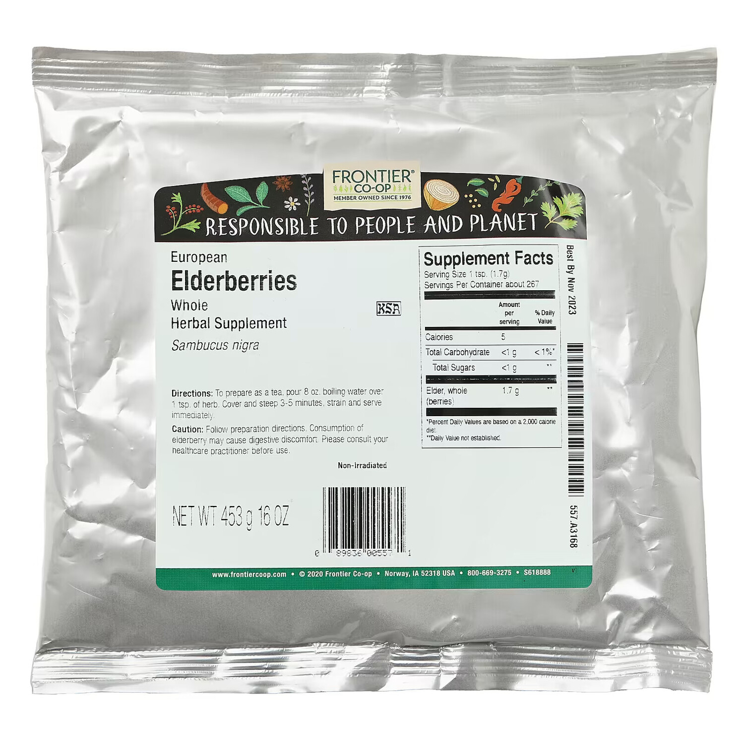 Сушеные ягоды бузины обладают фруктовым ароматом и кисло-сладким фруктовым вкусом. Ягоды имеют темно-фиолетовую окраску и морщинистый вид. Стебель должен оставаться небольшим или отсутствовать.