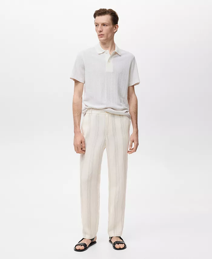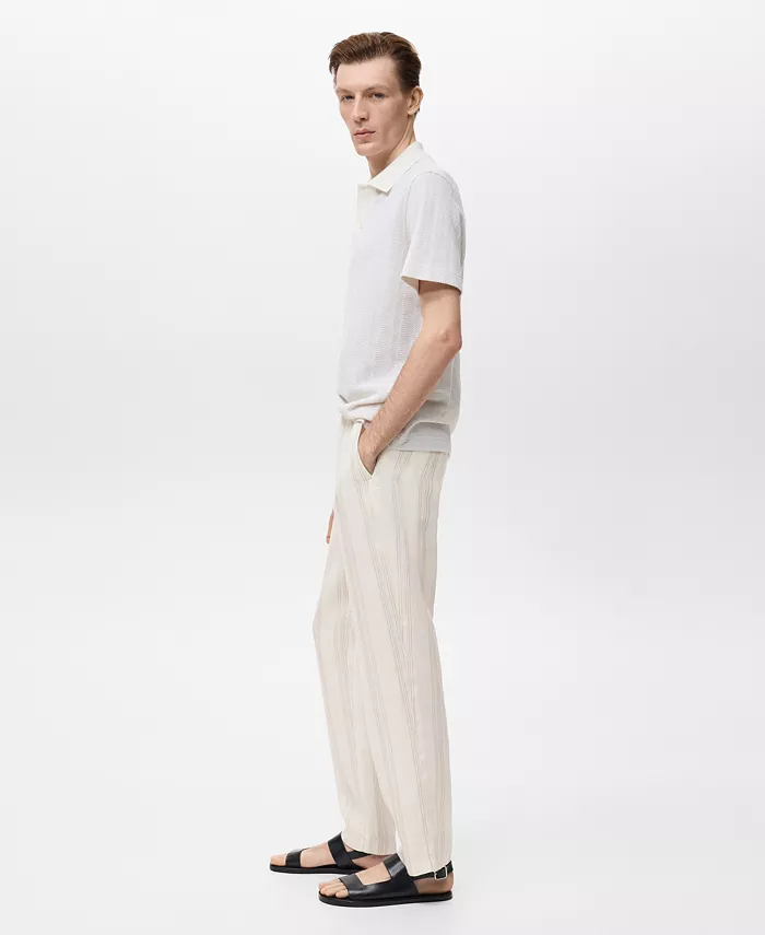 Элегантный повседневный стиль начинается с льняных брюк с эластичным поясом от Mango. Эти брюки прямого кроя из льна с принтом в полоску, эластичным поясом по бокам, шлевками для ремня, двойной застежкой на пуговицы и молнию, боковыми карманами и прорезными карманами сзади.