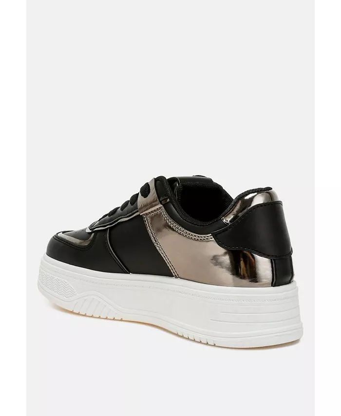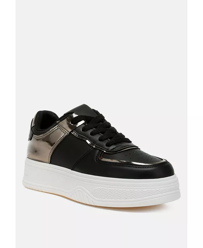 Эти кроссовки из искусственной кожи с плоской подошвой и металлическими вставками сочетают в себе уникальный комфорт и стиль. Броская металлическая деталь в сочетании с классической шнуровкой создает свежий и модный образ. Эти кроссовки идеально дополнят любой базовый образ!