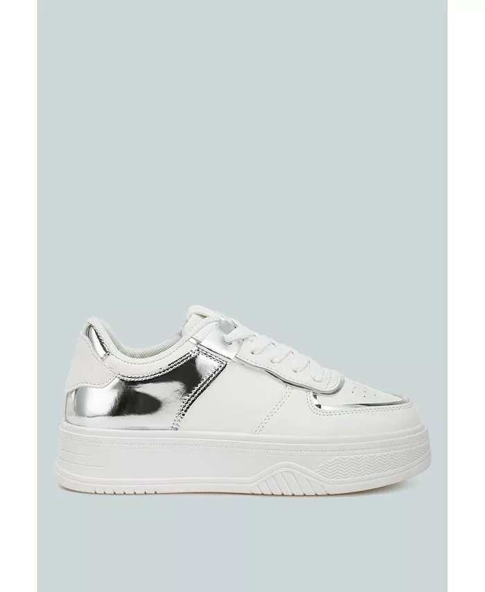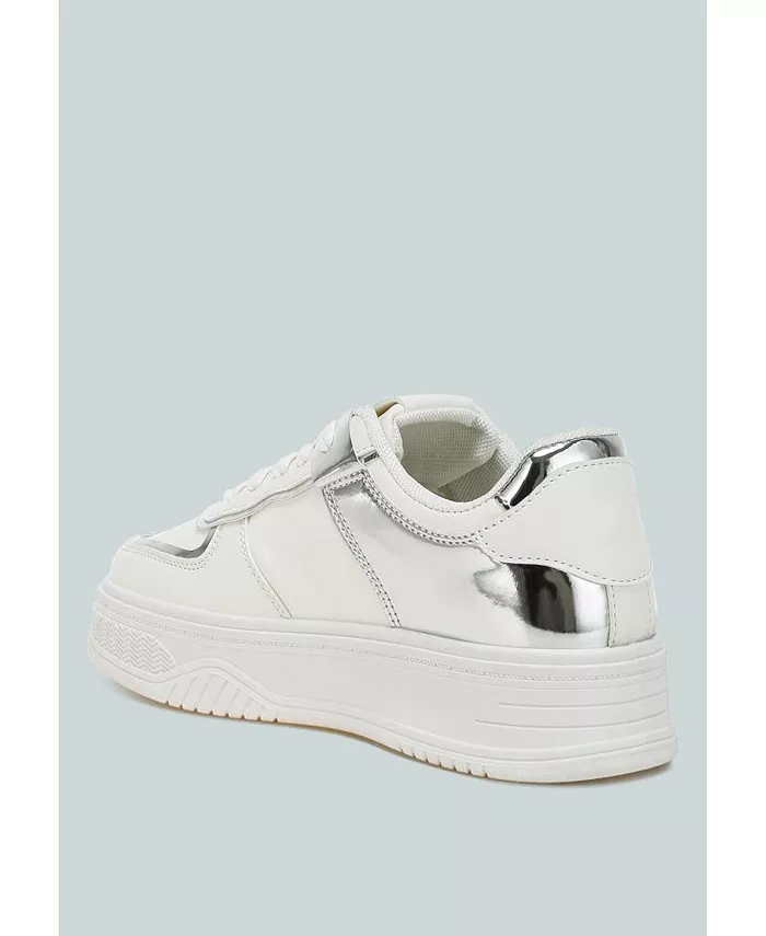 Эти кроссовки из искусственной кожи с плоской подошвой и металлическими вставками сочетают в себе уникальный комфорт и стиль. Броская металлическая деталь в сочетании с классической шнуровкой создает свежий и модный образ. Эти кроссовки идеально дополнят любой базовый образ!