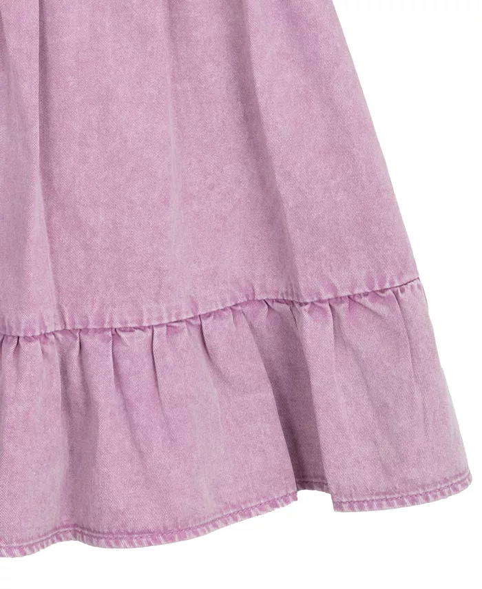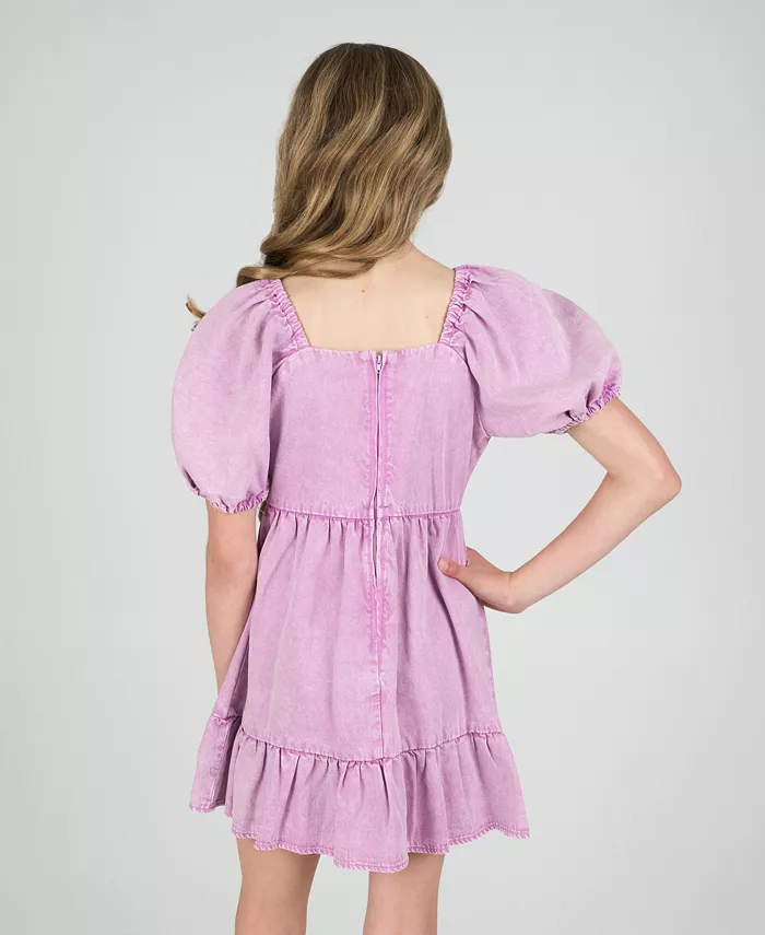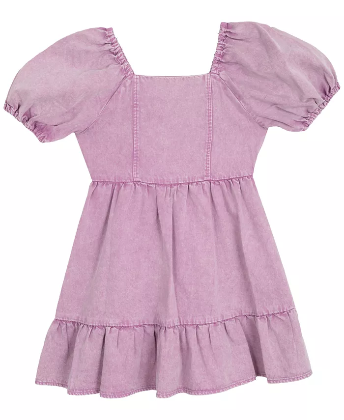 Это платье с рукавами-фонариками для девочек из мягкого стираного денима добавляет игривого очарования. Оно имеет квадратный вырез, оборчатый подол и модные объемные рукава, что создает повседневный и милый образ.