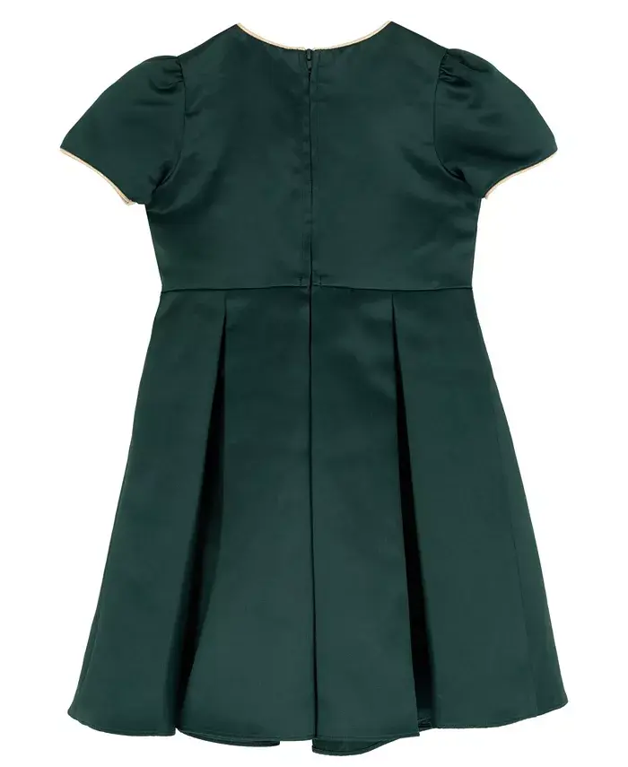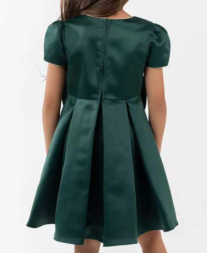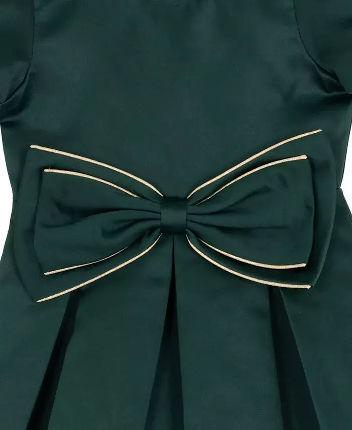 Это праздничное платье от Rare Editions, украшенное праздничным блеском, украшено изящной шнуровой окантовкой по вырезу и рукавам, которые придают ему еще больше очарования. Крупный бант с плиссированными передними панелями танцует при каждом шаге и смехе, создавая радостный, кружащийся силуэт.
