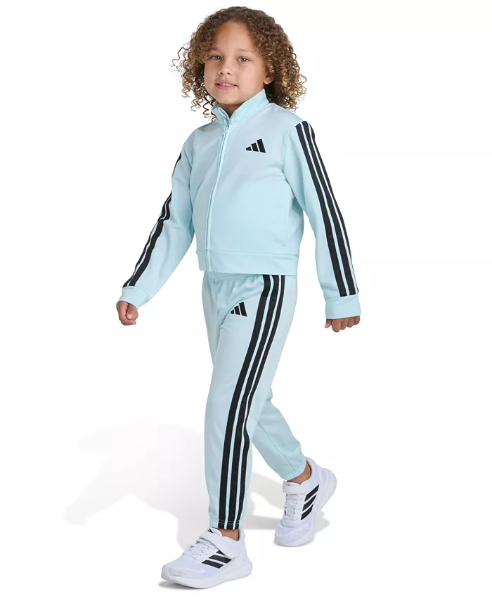 Этот комплект adidas, состоящий из куртки на молнии по всей длине и соответствующих спортивных брюк, выполнен из гладкого полиэстерового трикотажа с фирменными тремя полосками. Боковые карманы, эластичный пояс и ребристые манжеты обеспечивают практичный комфорт, а классический крой не стесняет движений во время повседневной игры.
