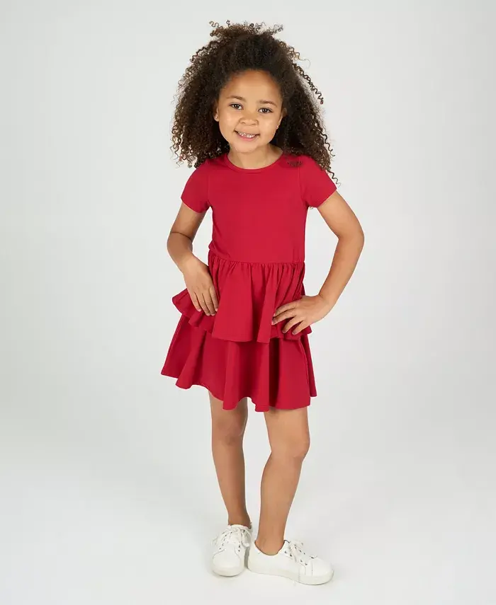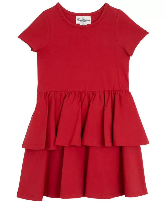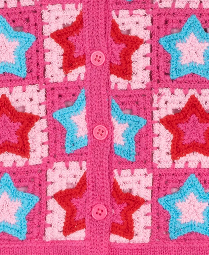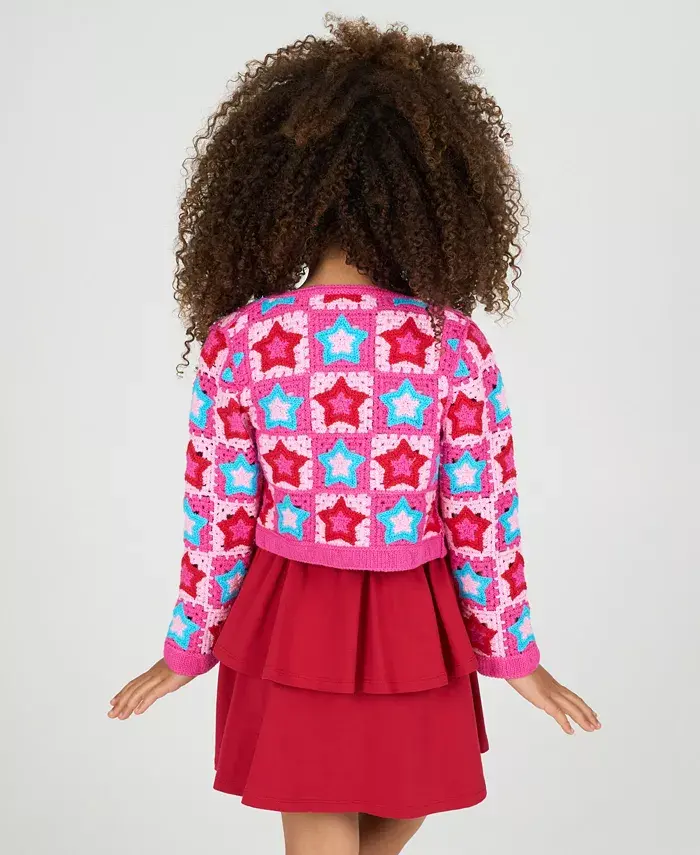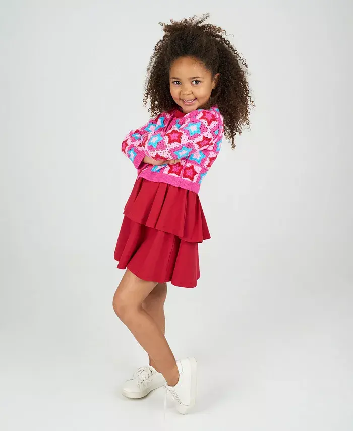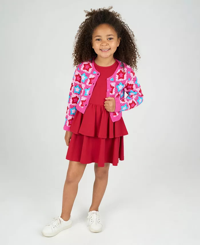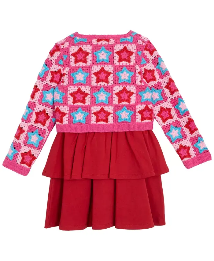 Этот комплект из двух предметов для девочек, излучающий ретро-стиль, включает в себя нежно-красное многоярусное платье и кардиган со звездами в стиле поп-арт - идеальный вариант для создания яркого образа как в классе, так и на вечеринке по случаю дня рождения.