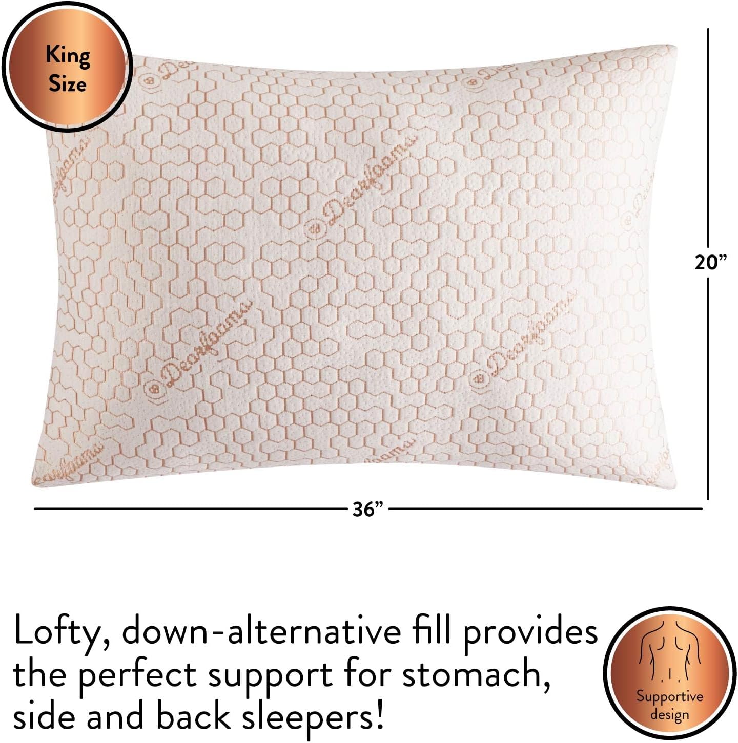 100% полиэстер НАБОР ИЗ 2 ПОДУШЕК: Dearfoams от бренда, подарившего вам ваши любимые тапочки. Набор из двух подушек размера King Size размером 50x91 см идеально подходит для наволочек размера King Size. МЯГКИЙ ТРИКОТАЖНЫЙ ЧЕХОЛ С МЕДНЫМ НАПОЛНЕНИЕМ: Медь обладает множеством природных свойств и преимуществ, которые способствуют здоровому сну и помогают бороться с неприятными запахами. Некоторые исследования показывают, что медь улучшает качество сна и кровообращение. Высококачественная и прочная ткань рассчитана на долгий срок службы. РОСКОШЬ ОТЕЛЯ У ВАС ДОМА: Эти трикотажные подушки средней плотности обеспечивают невероятно мягкое и комфортное место для сна. Наполнитель из полиэстера обеспечивает им приподнятую форму, что делает их идеальными для сна любого типа: от сна на боку до сна на спине и на животе. ПРОСТОЙ УХОД: Подушки можно стирать в стиральной машине, они долговечны, поэтому за ними легко ухаживать. СДЕЛАНО В США: наполнитель производится локально, в США, из отечественных и импортных материалов. Мы используем только свежий наполнитель для наших подушек, чтобы гарантировать высокое качество.