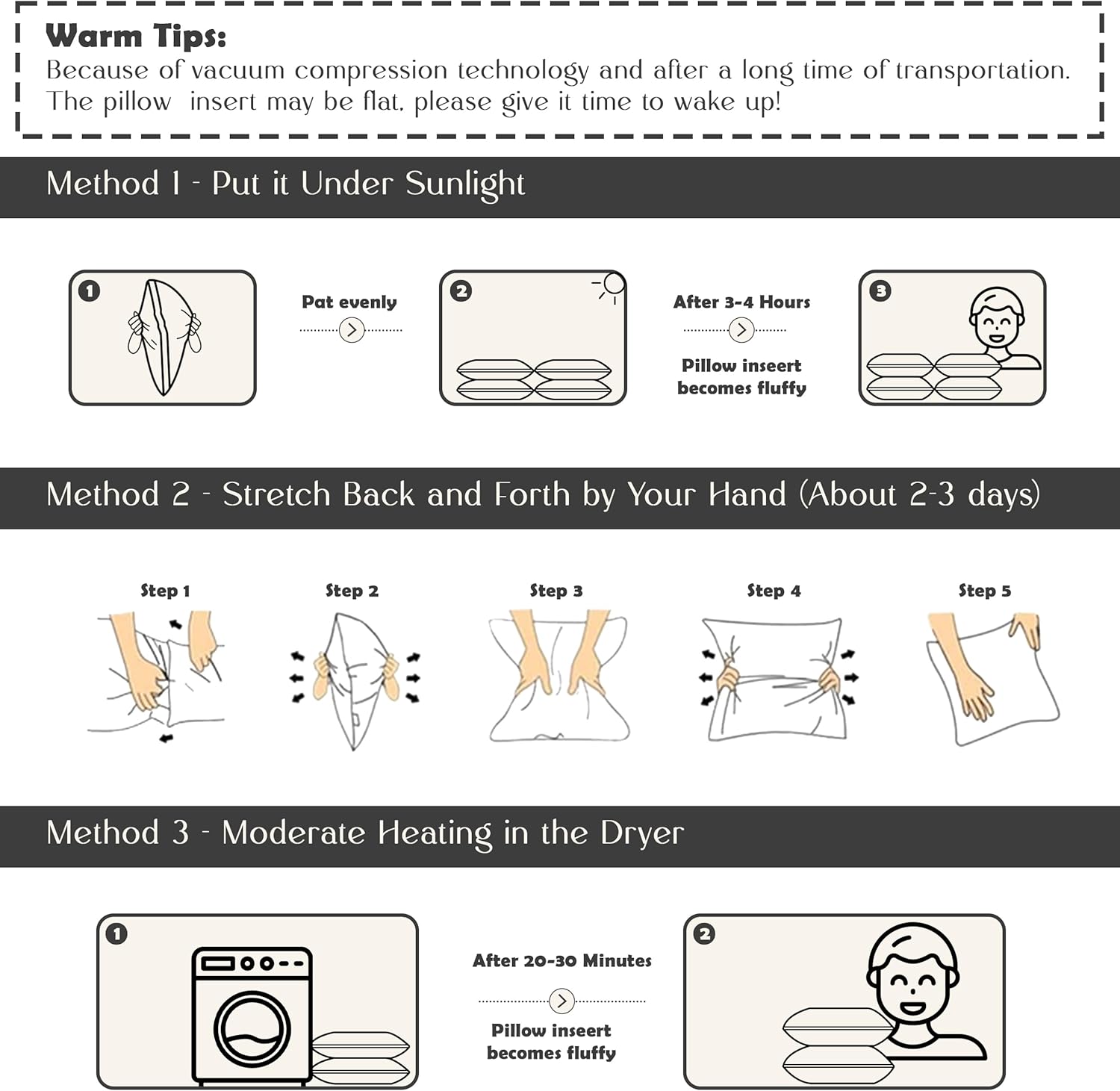 ВЗБИВАНИЕ ДЛЯ КОМФОРТНОГО КОМФОРТНОГО РАСПЫЛЕНИЯ: Нашим жёстким подушкам размера «king-size» требуется 48–72 часа, чтобы полностью распушить подушки. Ускорьте процесс, поместив их на несколько часов на солнце или высушивая в сушильной машине с теннисными мячами, завёрнутыми в носки.