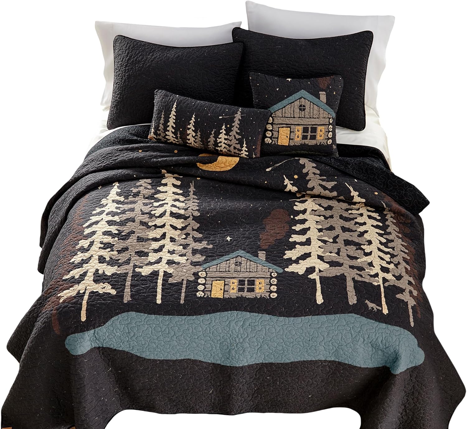 Эта очаровательная коллекция постельного белья из хлопкового стеганого полотна в деревенском стиле отображает маленькую хижину, расположенную в сосновом лесу под лунным светом и звездами.