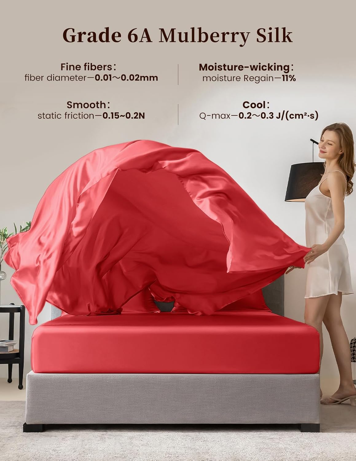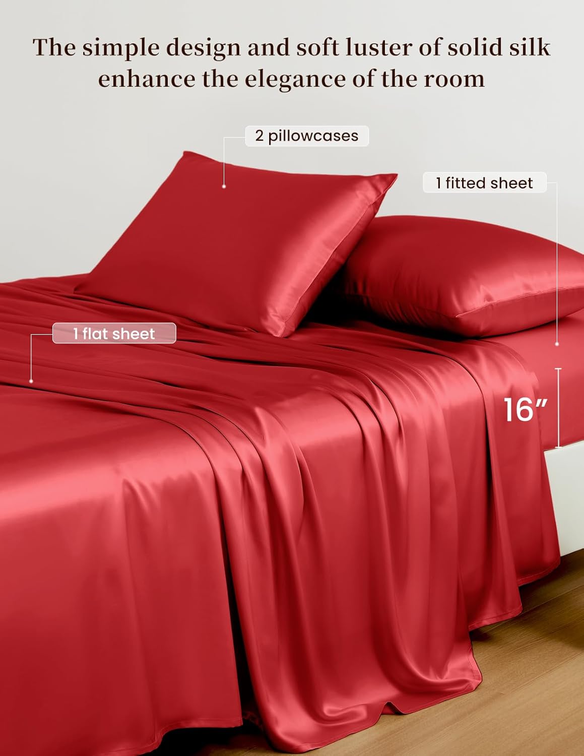 КОМПЛЕКТ ПОСТЕЛЬНОГО БЕЛЬЯ ИЗ 100% ШЕЛКА MULBERRY: комплект из 4 шелковых простыней включает в себя 1 простыню на резинке (39 дюймов x 75 дюймов, 16 дюймов с глубоким карманом), 1 простыню без подкладки (67 дюймов x 96,5 дюймов) и 2 наволочки на молнии (20 дюймов x 26 дюймов).