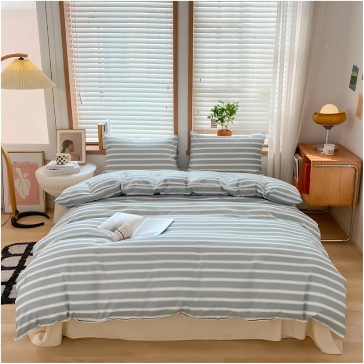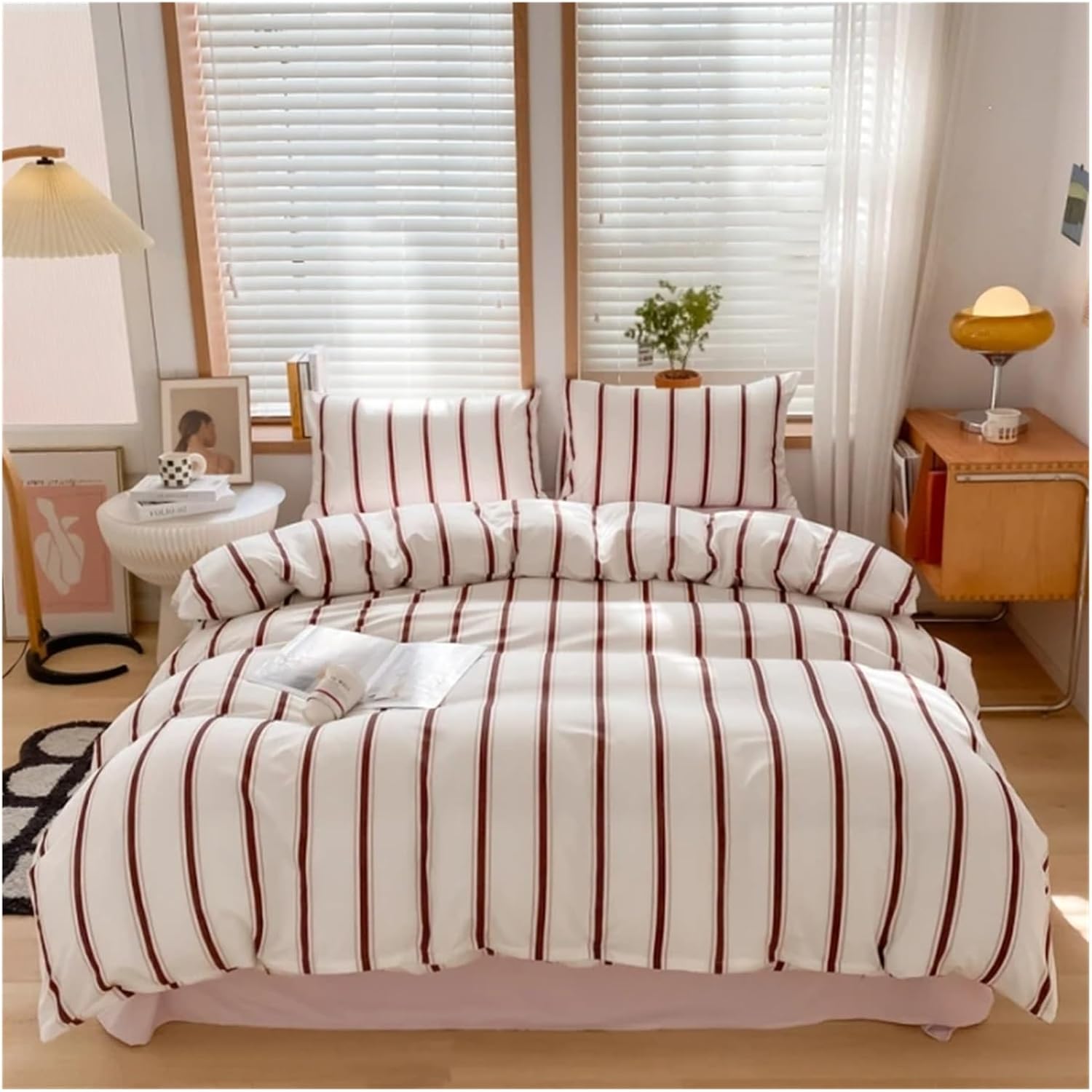Комплект постельного белья: скрытая застежка-молния; четыре внутренние угловые завязки удерживают его на месте; простой полосатый дизайн.