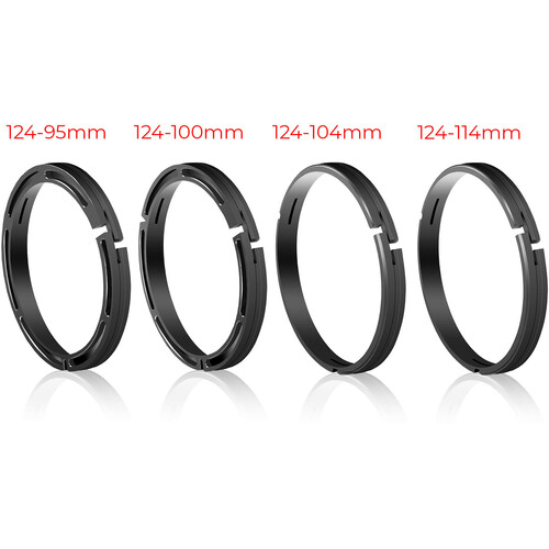 Этот комплект адаптерных колец от SHAPE, разработанный для объективов с передним диаметром 95, 100, 104 или 114 мм, обеспечивает легкое сжатие и надежную фиксацию матовой коробки SHAPE на объективе. Он также позволяет устанавливать матовую коробку на объектив без использования стержней.