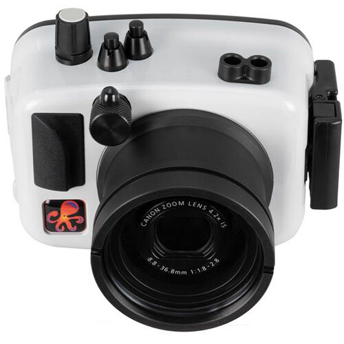 Снимайте HD-видео и фотографии на глубине до 200 футов под поверхностью с помощью компактного и легкого подводного бокса Action Underwater Box от Ikelite для цифровой камеры Canon PowerShot G7 X Mark III. Предусмотрены два порта для подключения оптоволоконных кабелей для внешних вспышек.