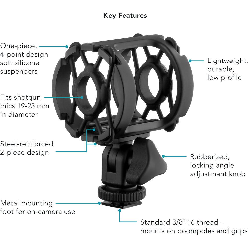 Универсальное крепление типа шок Auray DUSM-1 оснащено четырехточечным креплением для установки микрофонов-пушек и других цилиндрических микрофонов диаметром 0,74–0,98" (19–25 мм). Крепление легко наклоняется с помощью прорезиненной ручки регулировки. Имеется встроенное крепление для установки камеры, а резьбовое соединение 3/8"-16 в основании позволяет закрепить крепление на микрофонных удочках и универсальных рукоятках.