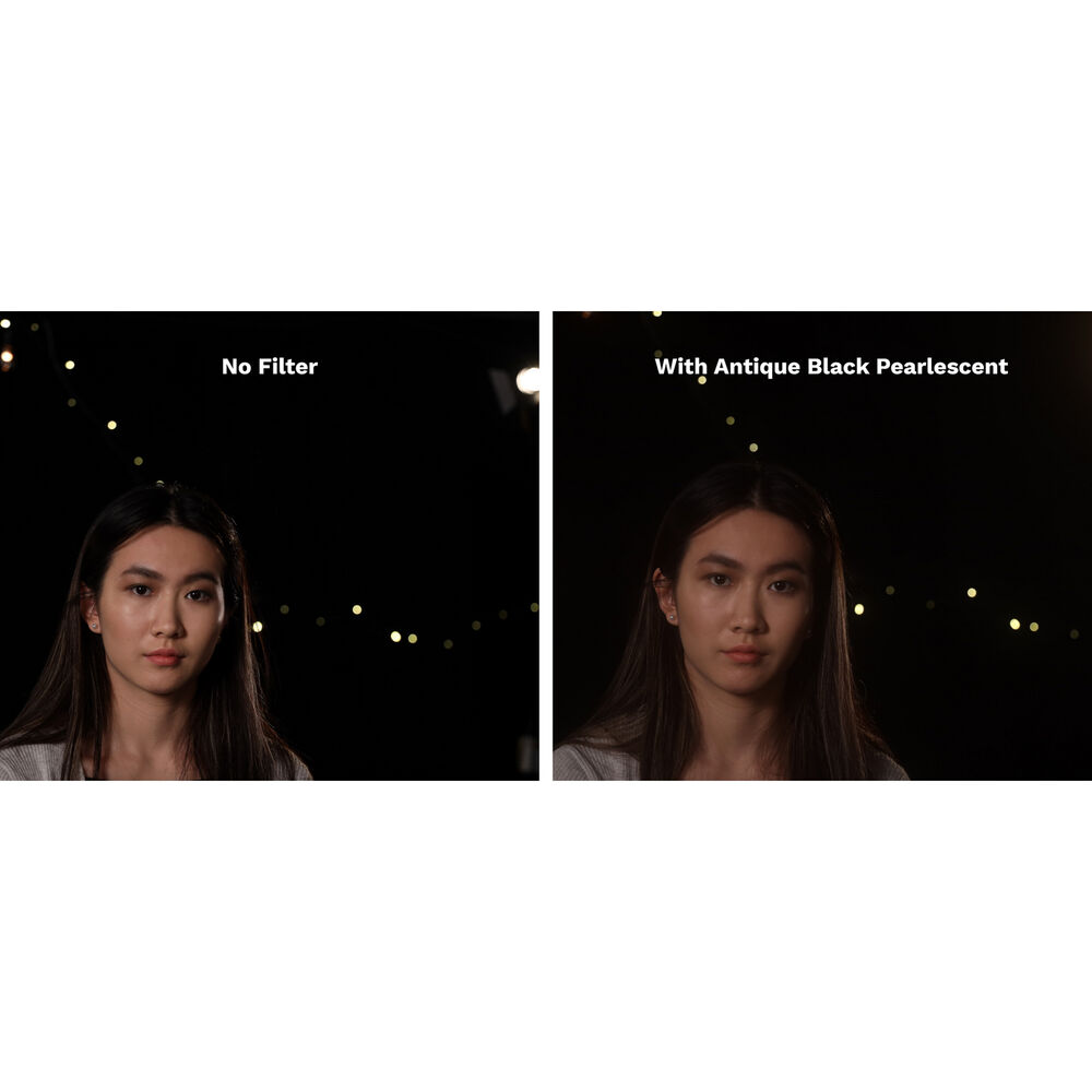 Черный перламутровый фильтр Antique Black Pearlescent Filter размером 4 x 4 дюйма и плотностью 1/8 от Tiffen делает тон кожи теплее и использует черный перламутровый компонент для сохранения глубоких черных оттенков, сохраняя детализацию теней, особенно на лице. В результате получается более мягкое изображение без чрезмерного ореола или потери контрастности.