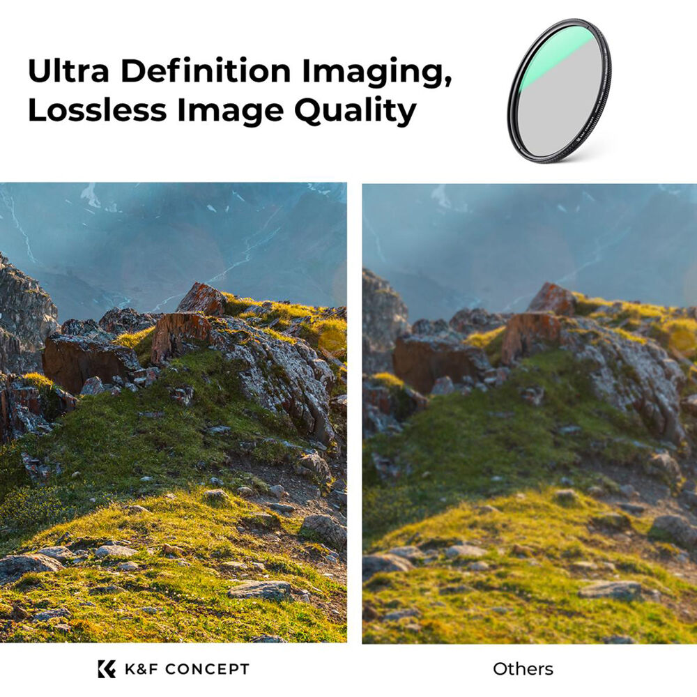 82-миллиметровый фильтр CPL серии Nano-X со сверхнизким отражением от K&F Concept имеет коэффициент отражения 0,1% и устраняет 99,9% поляризованного света. Фильтр обеспечивает высокий коэффициент пропускания 45%. Фильтр изготовлен из оптического стекла AGC с двусторонним 28-слойным покрытием, что делает его водонепроницаемым, маслостойким, устойчивым к царапинам и легко очищаемым. Рамка фильтра изготовлена из алюминиево-магниевого сплава и имеет толщину всего 5,3 мм.