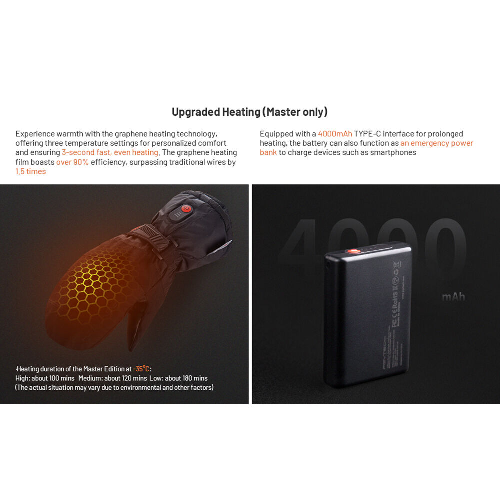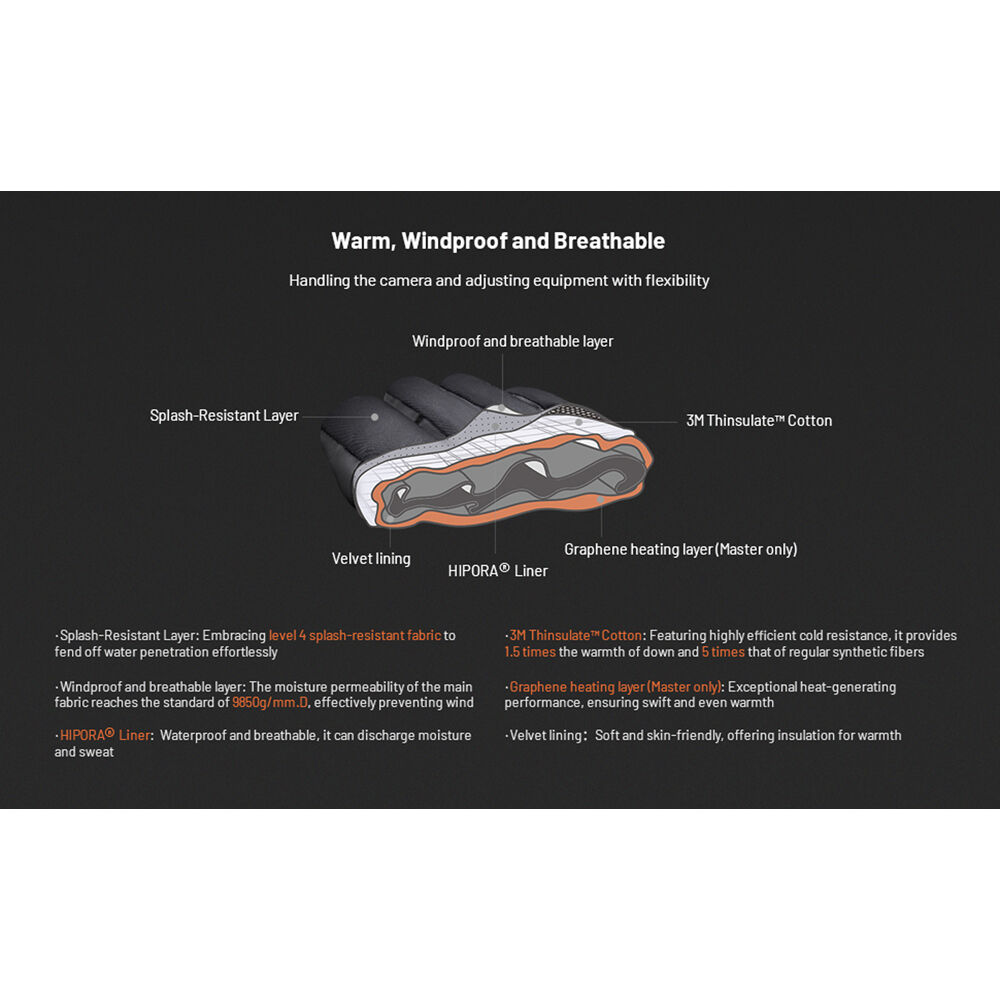 Перчатки Master Photography Gloves от PGYTECH сохранят ваши руки в тепле при съемке на морозе. Они также обеспечивают защиту от ветра и воды благодаря графеновому нагревательному слою и двум аккумуляторам типа C-cell емкостью 4000 мАч для расширенного обогрева. Мягкие кожаные ладони обеспечивают повышенный комфорт и нескользящий захват.