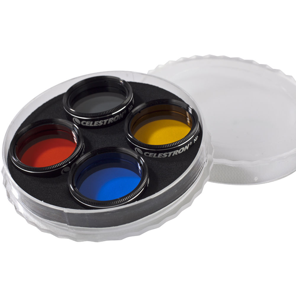 1,25-дюймовый набор фильтров для окуляра от Celestron содержит четыре различных фильтра, установленных в черных анодированных алюминиевых ячейках, упакованных в пластиковый футляр. Все четыре фильтра для окуляра имеют резьбу, подходящую для большинства окуляров и аксессуаров 1,25". Ячейки каждого фильтра имеют двойную резьбу, что позволяет использовать их в различных комбинациях. Они обеспечивают полную прозрачную апертуру 26 мм. В этот набор фильтров входят: ND-96-0.3 Нейтральный фильтр, #12 Насыщенно-желтый фильтр, #21 Оранжевый фильтр и #80A Синий фильтр.