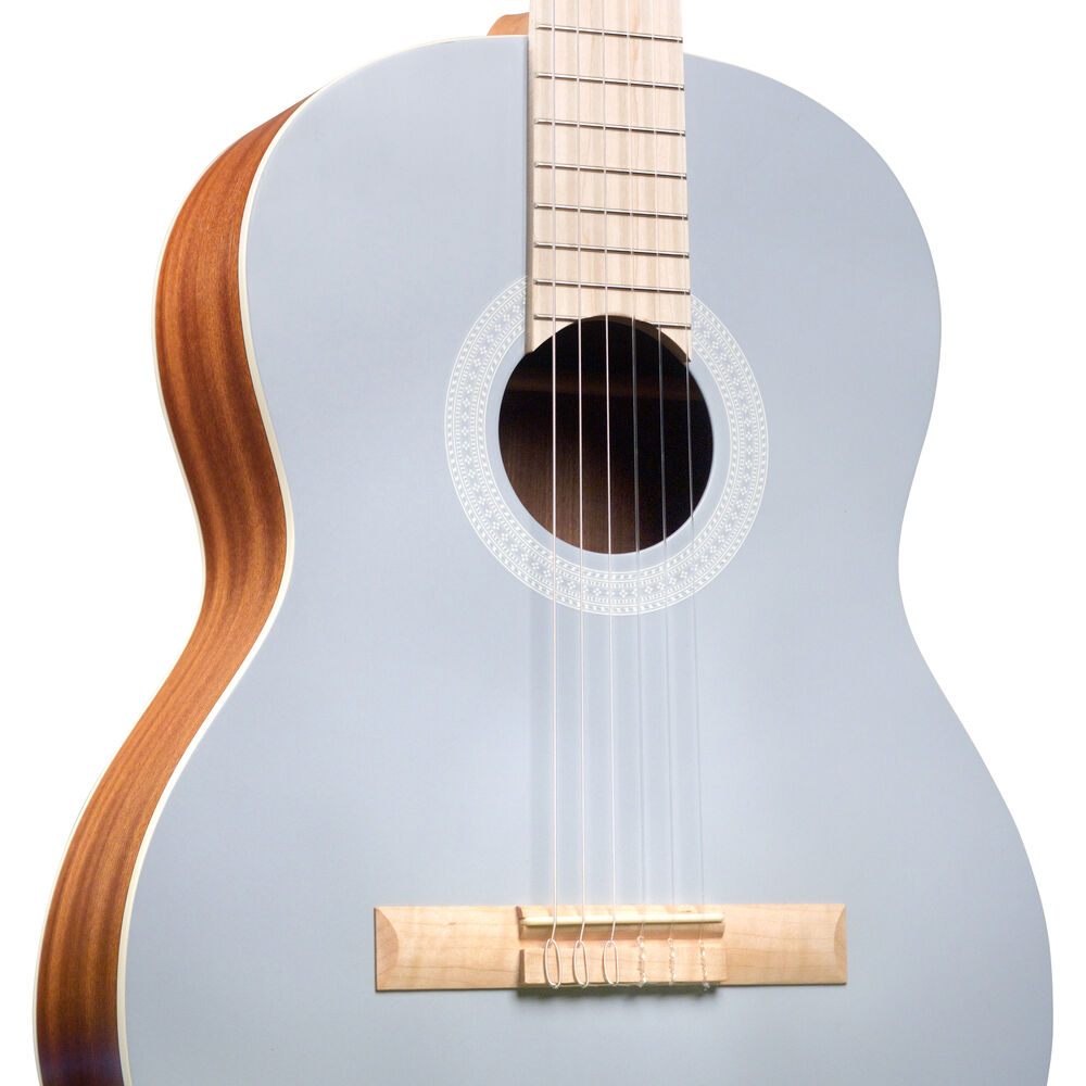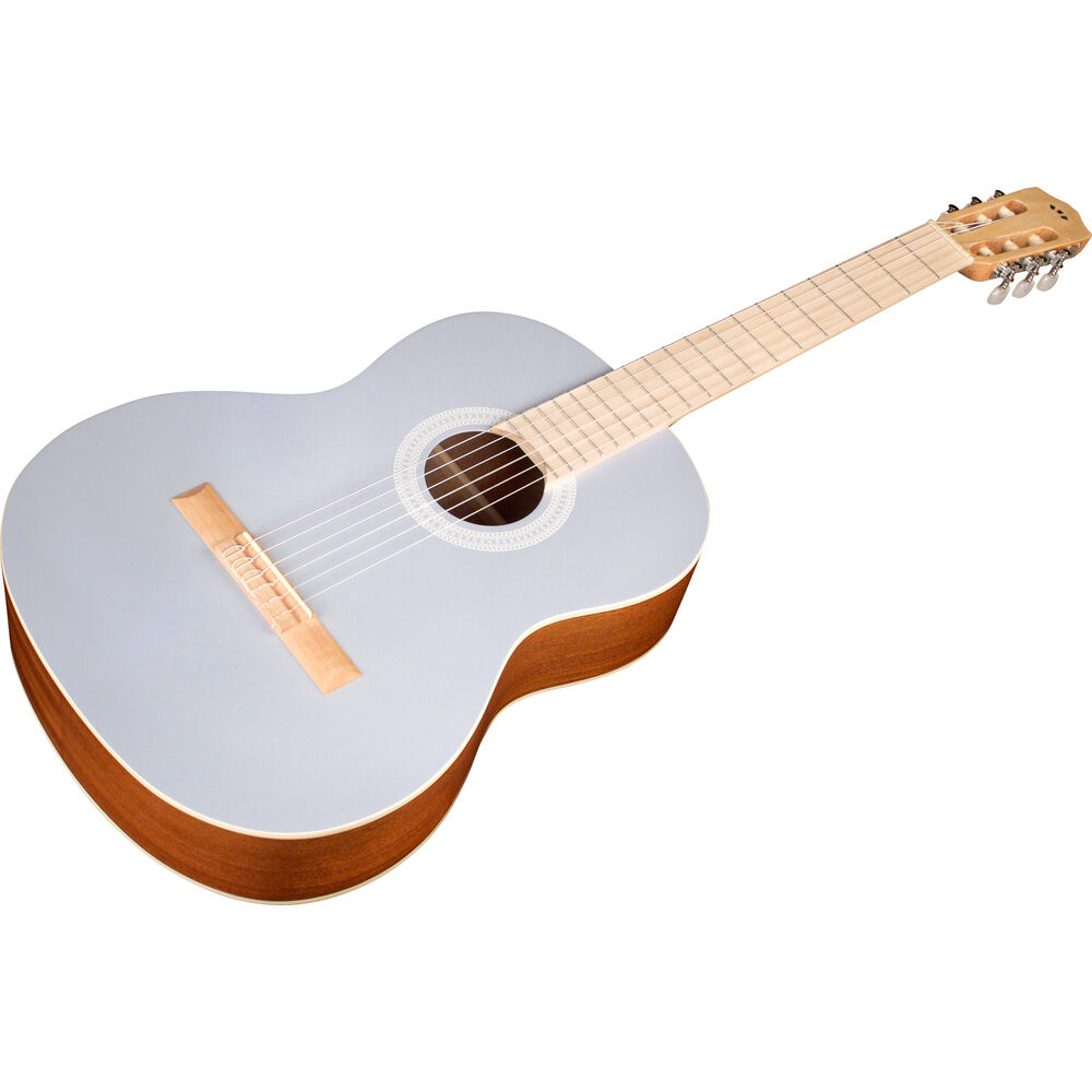 Насладитесь свежим взглядом на традиционную эстетику классической гитары с нейлоновыми струнами с Cordoba Protégé C1 Matiz, моделью с отделкой Pale Sky, которая обеспечивает проекцию и теплоту, ассоциируемые с классической нейлоновой гитарой. Инструмент имеет верхнюю деку из ели, нижнюю деку и обечайки из красного дерева. Голова, бридж и полноразмерная накладка грифа из клена обеспечивают яркий внешний вид с живым тональным откликом.