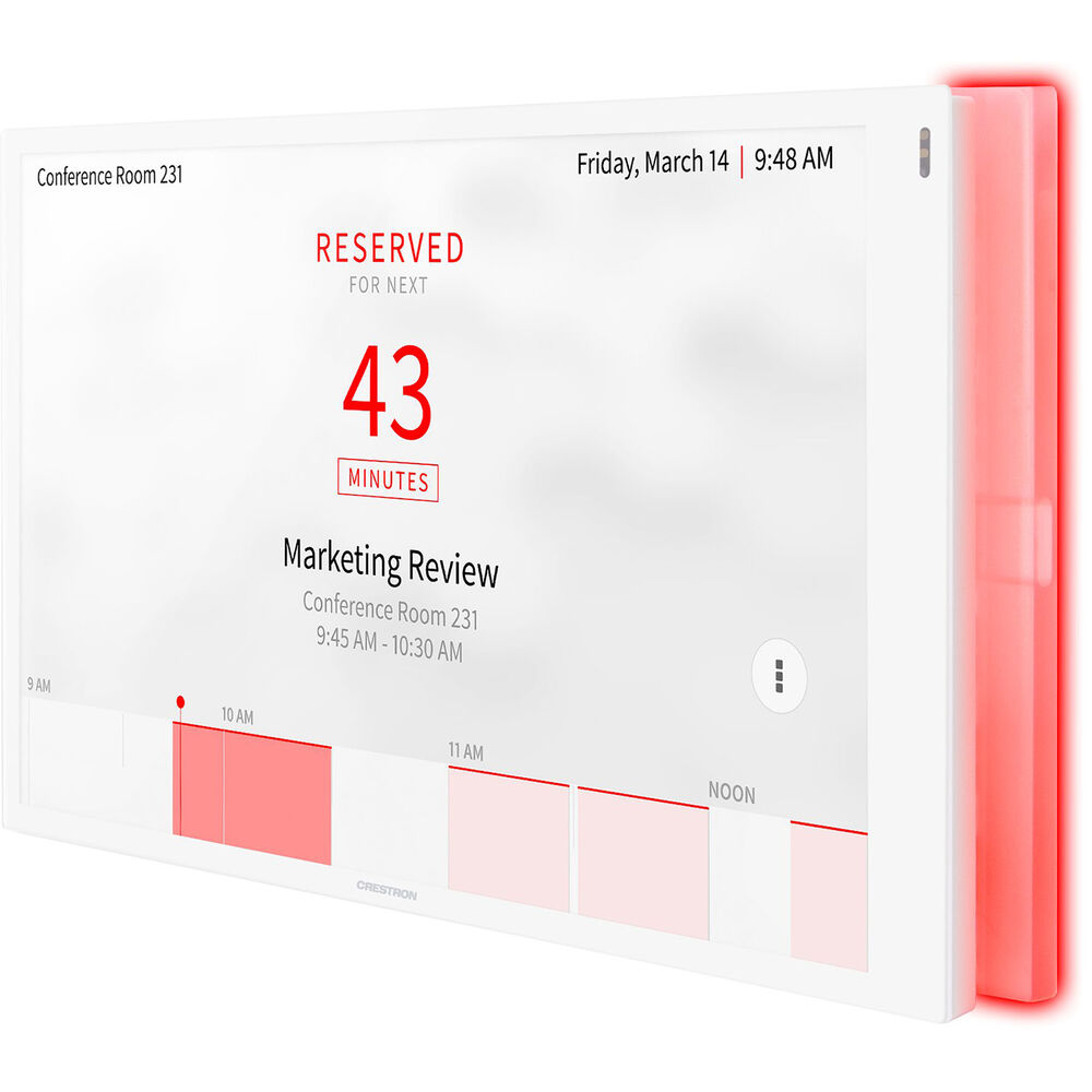 Белая световая панель доступности помещения Crestron TSW-1070-LB для сенсорных экранов серии TSW-1070 обеспечивает 180° визуальную индикацию доступности помещения в рамках комплексного решения по планированию помещений предприятия. TSW-1070-LB легко устанавливается на заднюю часть сенсорного экрана и светится ярко-зеленым или красным цветом, указывая на состояние доступности помещения, с возможностями пользовательского смешивания цветов и программирования.