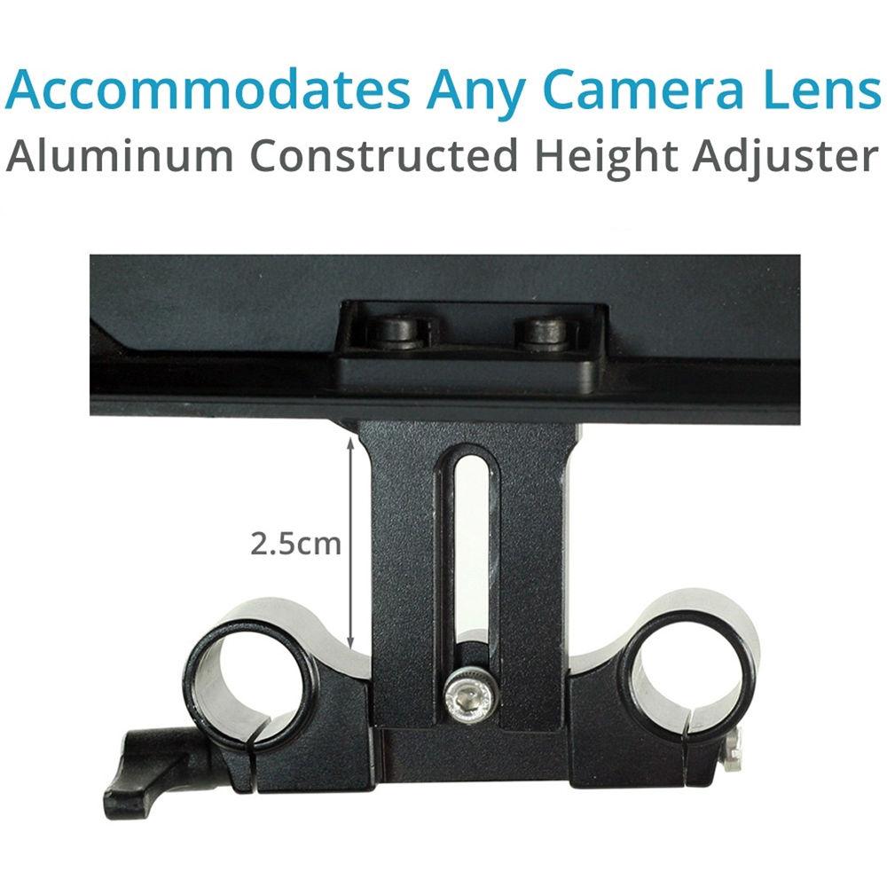 Proaim Camera Sunshade Matte Box — это 15-миллиметровый матовый бокс с креплением на стержне для объективов с внешним диаметром 95 мм или меньше. Он регулируется по высоте на зажиме стержня для объективов разного размера и совместим с объективами с фокусным расстоянием 35 мм или длиннее. Он включает в себя съемные верхние, нижние и боковые флажки. Оправа и зажим стержня изготовлены из алюминия, а матовый бокс — из прочного пластика.