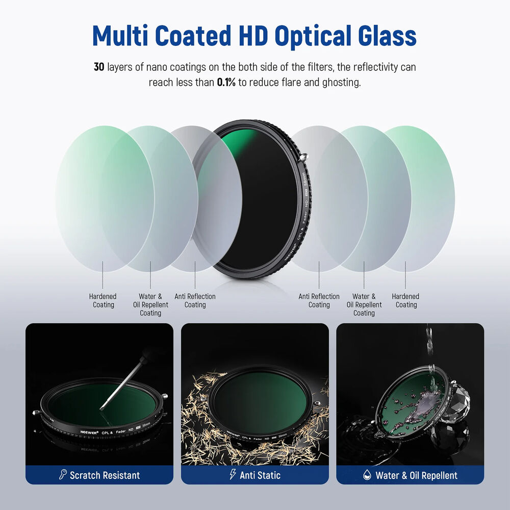 • Комбинация 2 в 1 с переменным ND-фильтром и CPL-фильтром Neewer (82 мм, от 1 до 5 ступеней)