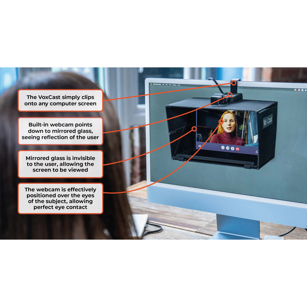 При съемке следующего видеоблога с прямым обращением или при обновлении настроек видеоконференцсвязи PrimeLight Design VoxCast VC10 создает имитацию телесуфлера на ноутбуках и компьютерных мониторах, используя ту же технологию зеркального стекла, что и в профессиональных суфлерах, чтобы направлять ваши глаза на нужный объект, не мешая камере. Воспользуйтесь всеми преимуществами встроенной веб-камеры HD, подключив съемную светодиодную кольцевую подсветку к порту USB.