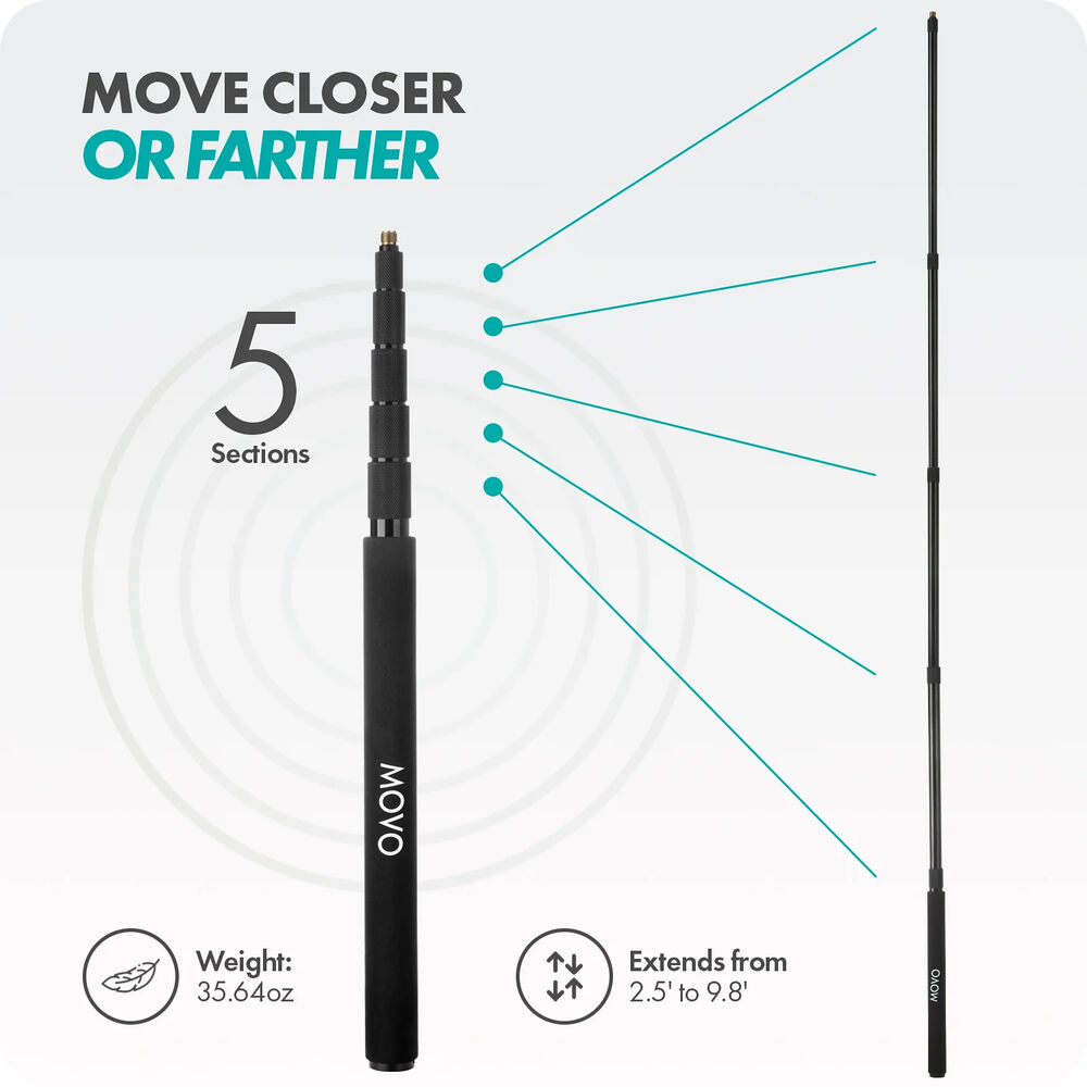Идеально подходит для кинопроизводства, создания контента и звукового дизайна, Movo Photo CMP-17 — это прочная, но легкая штанга с универсальной совместимостью с направленными микрофонами благодаря резьбовому штифту 3/8"-16 и адаптеру 5/8". Благодаря пяти секциям, закрепленным поворотными замками, и регулировке высоты от 2,5 до 9,8 футов эта штанга может поддерживать различные сценарии производства.