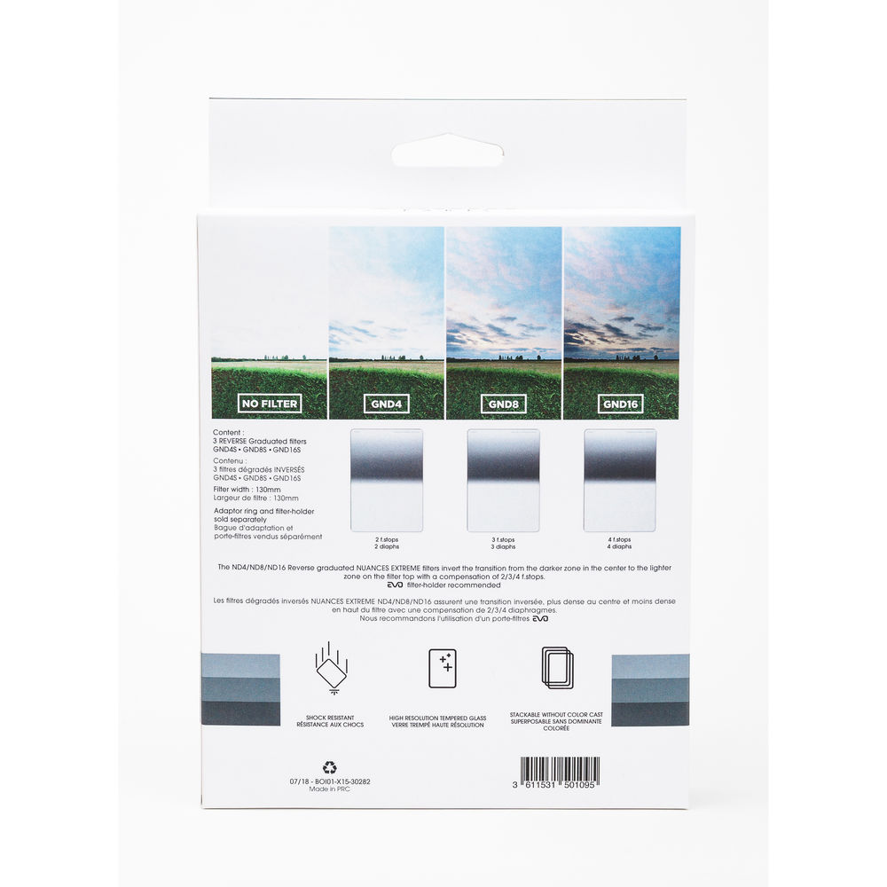 Этот набор 130 x 170 мм нейтрально-градуированных фильтров с мягким краем Cokin NUANCES Extreme X-Pro Series содержит три нейтрально-градуированных фильтра с обратным краем, которые предназначены для использования с держателем фильтров серии Cokin X-Pro. Каждый из них может быть применен для затемнения яркого неба, особенно во время восхода или заката солнца, при этом обеспечивая нормальную, неизменную экспозицию в других областях изображения.