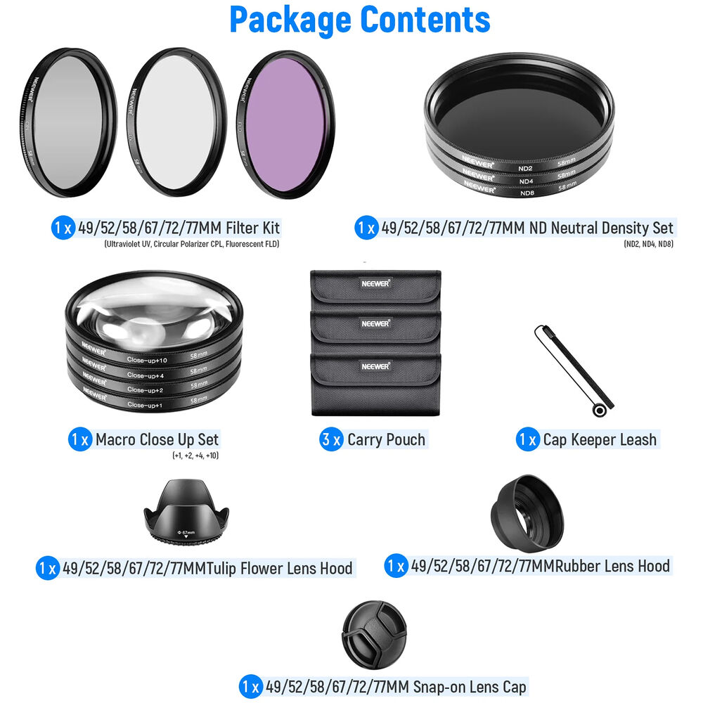 • Комплект Neewer из 10 фильтров с принадлежностями (62 мм)