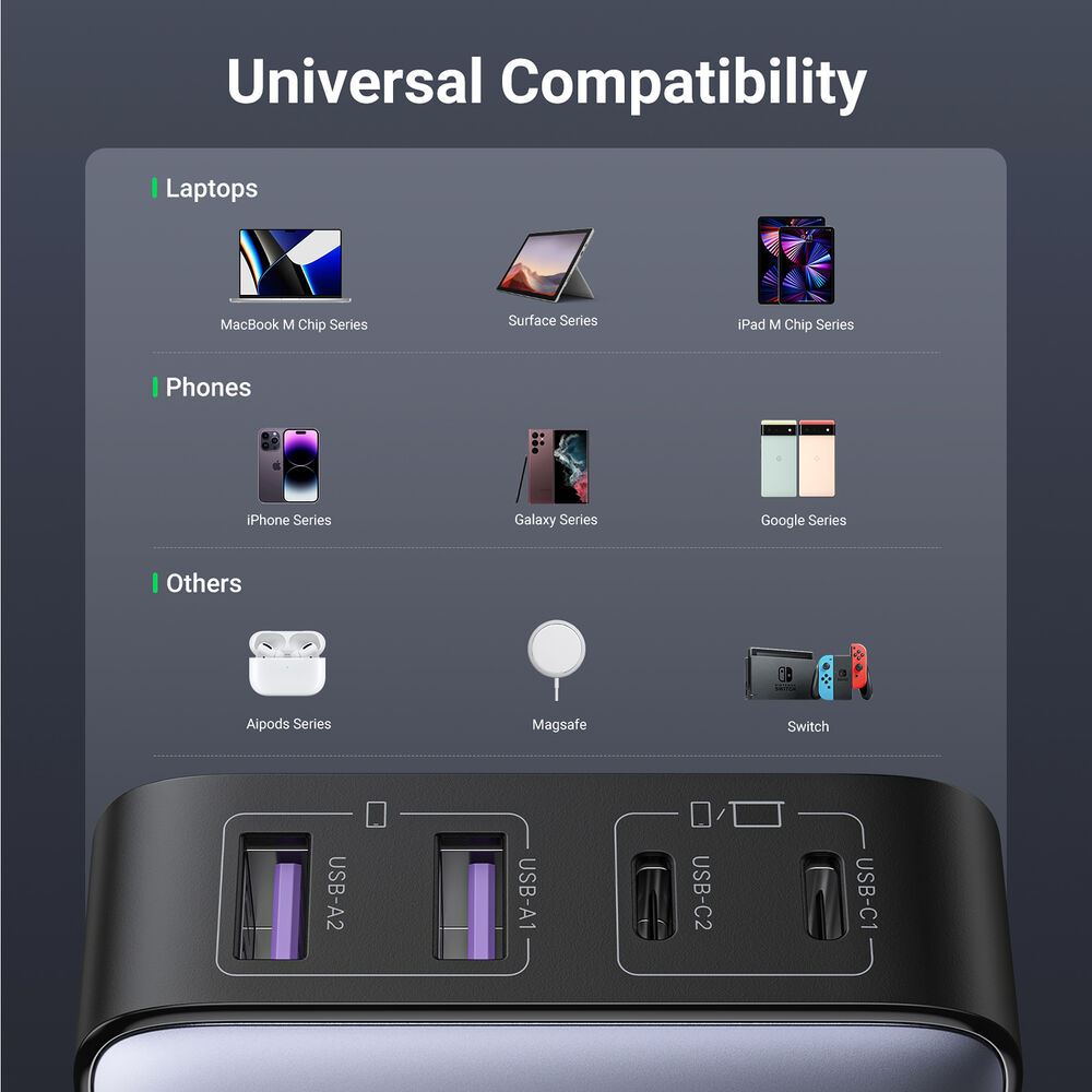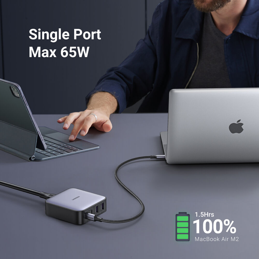 Настольная зарядная станция GaN с 4 портами USB размером около 3 дюймов от UGREEN занимает мало места на рабочем столе, но обладает большими возможностями зарядки. Вы получаете два порта USB-C и два порта USB-A, что позволяет заряжать до четырех устройств одновременно. Благодаря технологии GaN даже при компактном размере вы получаете значительное количество энергии. Мощность зарядки через четыре порта USB-C составляет до 65 Вт, при этом каждый порт USB-C обеспечивает до 65 Вт, а каждый порт USB-A — до 22,5 Вт. Этого достаточно для зарядки чего угодно: от чехлов для беспроводных наушников до MacBook.