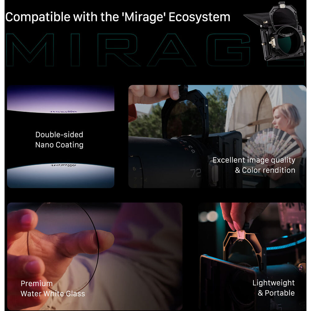 Фильтр Illusion Black Mist Filter диаметром 95 мм и степенью светосилы 1/8 от Tilta — это диффузионный фильтр с нанопокрытием, разработанный для круглого 95-миллиметрового стандарта матовой коробки Tilta Mirage. Снижая контрастность и создавая едва заметное свечение вокруг источников света, этот фильтр создает мягкую визуальную атмосферу, но при этом сохраняет больше резкости, детализации и контраста в тенях, чем это возможно со стандартным фильтром-туманом. Он идеально подходит для пользователей, которые ищут классический рассеянный вид, который не слишком отвлекает. Фильтр изготовлен из высококачественного стекла цвета воды и разработан для предотвращения отражений и обеспечения точной цветопередачи.