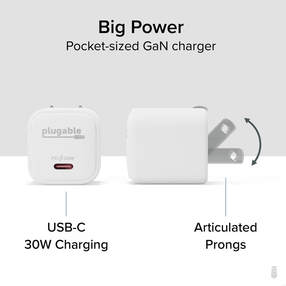 Для зарядки в карманном формате в дороге обратите внимание на 30-ваттное зарядное устройство GaN USB-C от Plugable. Эта белая упаковка из 3 кубиков оснащена откидной вилкой переменного тока с 2 контактами и одним портом USB-C PD. Благодаря технологии GaN это компактное зарядное устройство может по-прежнему выдавать до 30 Вт мощности на подключенное устройство. Зарядка является одновременно интеллектуальной и защищенной. Зарядное устройство взаимодействует с вашим устройством, чтобы определить оптимальное количество подаваемой мощности, а встроенная схема активно контролирует температуру во время зарядки и защищает от перегрева, перенапряжения и короткого замыкания.