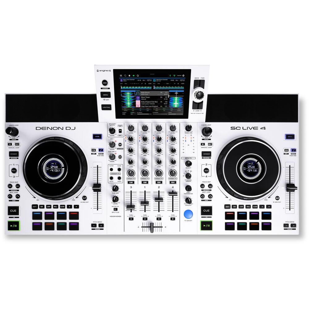 - Denon DJ SC LIVE 4 — автономная 4-дековая DJ-система с 7-дюймовым сенсорным экраном, встроенными динамиками и Wi-Fi (белая)