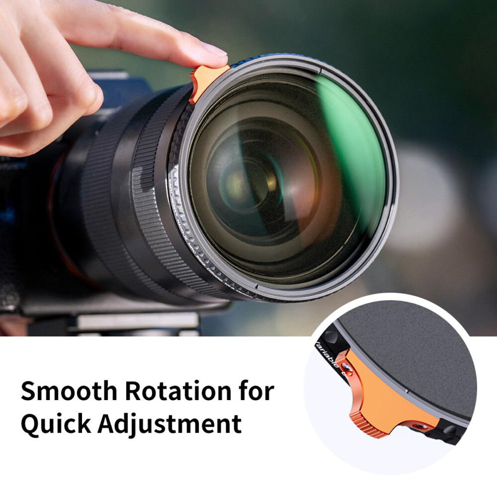 Фильтр Black Mist 1/4 с переменным нейтральным фильтром ND2-ND32 (1-5 ступеней) от K&F Concept сочетает в себе переменный нейтральный фильтр с фильтром Black Mist 1/4, создавая единый удобный фильтр кинематографического стиля. Он позволяет не только контролировать количество света, попадающего в объектив, но и добавлять мягкий кинематографический эффект мечты для фото и видео. Плотность фильтра легко меняется с помощью рычага быстрой регулировки, а усовершенствованная конструкция предотвращает появление на изображении узора X, характерного для фильтров низкого качества.