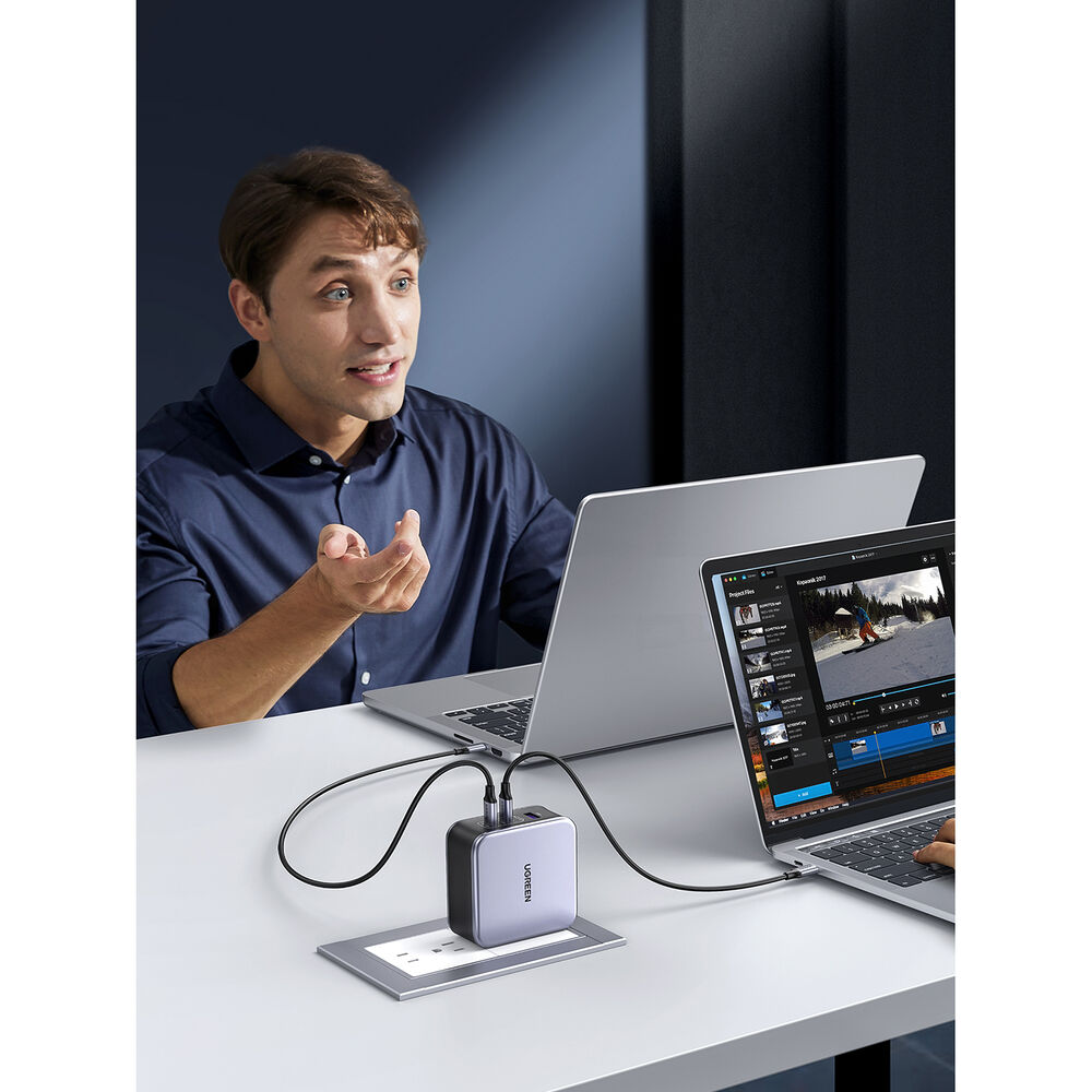 UGREEN. Два порта USB-C PD 3.1 поддерживают до 65 Вт каждый при совместном использовании и до 100 Вт или 140 Вт при индивидуальном использовании. Более чем достаточно мощности для быстрой зарядки чего угодно: от Chromebook до высококлассного игрового ноутбука или загруженного MacBook. Порт USB-A предназначен для зарядки дополнительных устройств, например, наушников, смартфона или планшета. Даже при такой высокой мощности технология GaN, используемая в конструкции адаптера, позволяет ему оставаться прохладным и компактным.