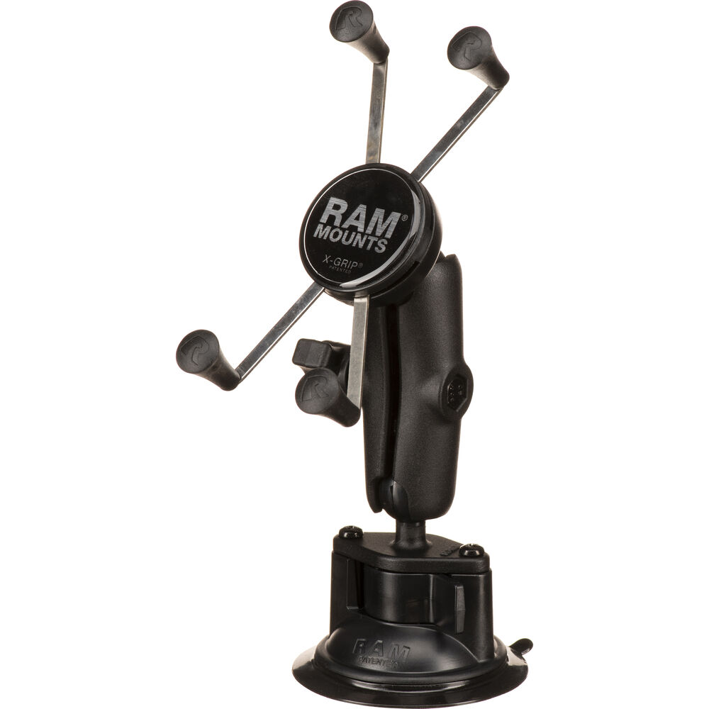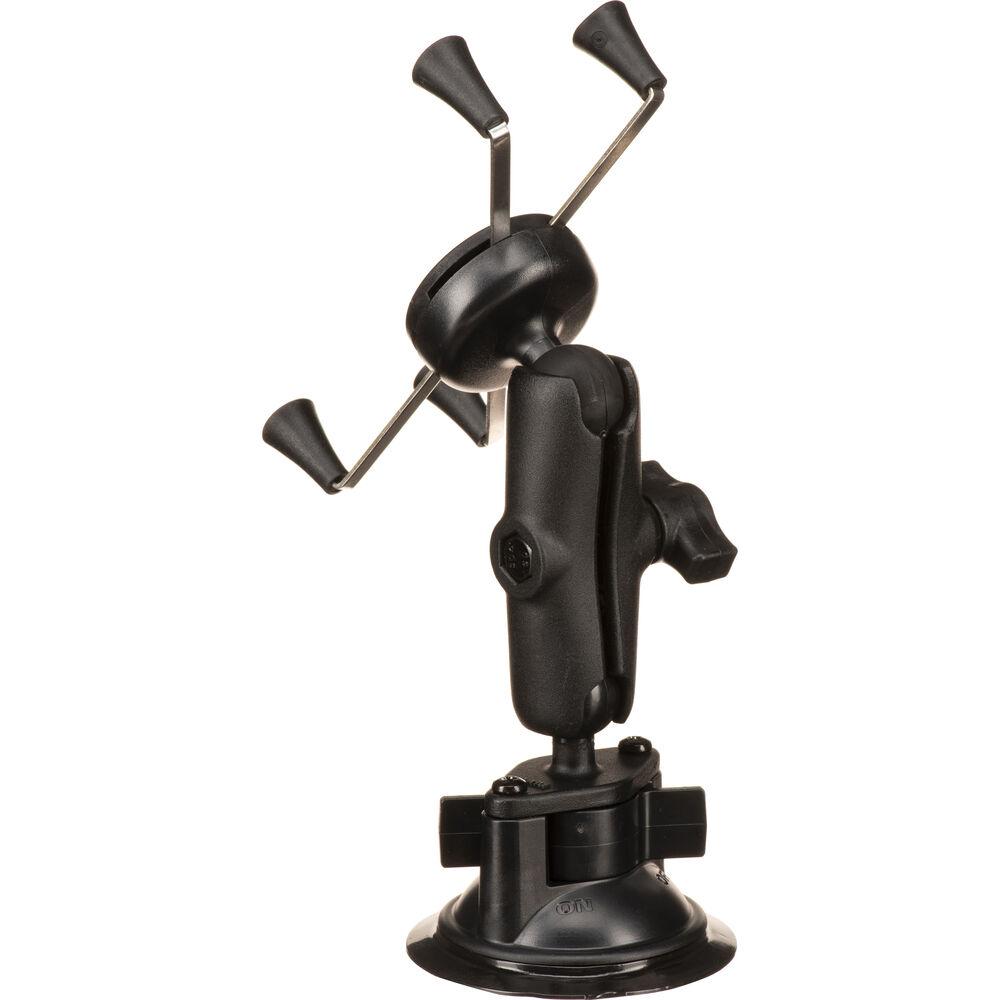 RAM MOUNTS. Это крепление состоит из основания с присоской Twist Lock 3,3 дюйма, двойного кронштейна и универсального подпружиненного держателя X-Grip IV. Держатель X-Grip IV расширяется и сжимается, что позволяет разместить любой 5-дюймовый смартфон или фаблет. В крепление встроена запатентованная система из резиновых шариков и гнезд диаметром 1 дюйм с точками регулировки на обоих концах держателя. Эта функция позволяет перемещать крепление в желаемое положение для просмотра. Удобные ручки захвата позволяют быстро вставлять и снимать устройство.