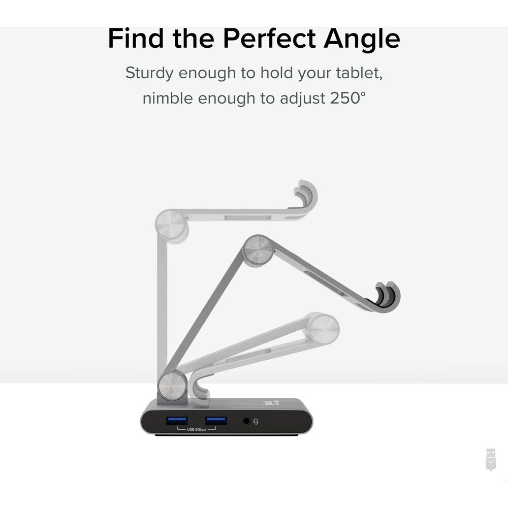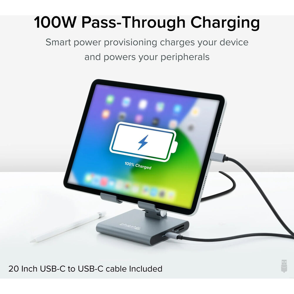 Plugable добавляет функциональность вашему устройству Windows, iPad Air, iPad Pro или Android, оснащенному портом USB-C с режимом DisplayPort Alt. Док-станция питается от порта USB-C со сквозной зарядкой 100 Вт и подключается к хост-устройству с помощью второго порта USB-C 3.2 Gen 1 со скоростью 5 Гбит/с. Также доступны порт HDMI 4K30 для передачи звука, два порта USB-A 5 Гбит/с, 3,5-мм разъем для наушников и микрофона, картридер SD и картридер microSD. Подставка изготовлена из цельного алюминия и достаточно прочна, чтобы выдержать 12,9-дюймовый iPad Pro, но при этом ее можно легко отрегулировать и даже сложить, чтобы поместить в сумку.