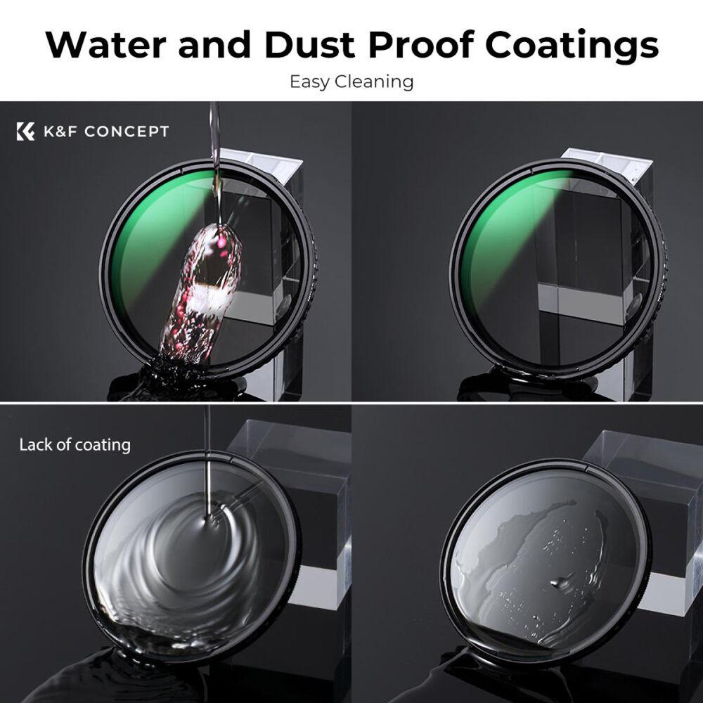 K&F Concept — это фильтр с титановым покрытием от 3 до 7 ступеней. Покрытие обеспечивает точность цветопередачи во время видеосъемки, устраняя желтый оттенок. Кроме того, технология шлифовки и полировки, применяемая с обеих сторон фильтра, обеспечивает точность изображений HD-качества без потери резкости. Поверхность фильтра также окислена и подвергнута пескоструйной обработке для минимизации постороннего света и отражений. Фильтр изготовлен из японского оптического стекла с двусторонним 28-слойным нанопокрытием, что делает фильтр водонепроницаемым, маслостойким, устойчивым к царапинам и простым в очистке. Рамка фильтра плавно вращается между пятью обозначениями нейтральной плотности и имеет функцию самоблокировки.