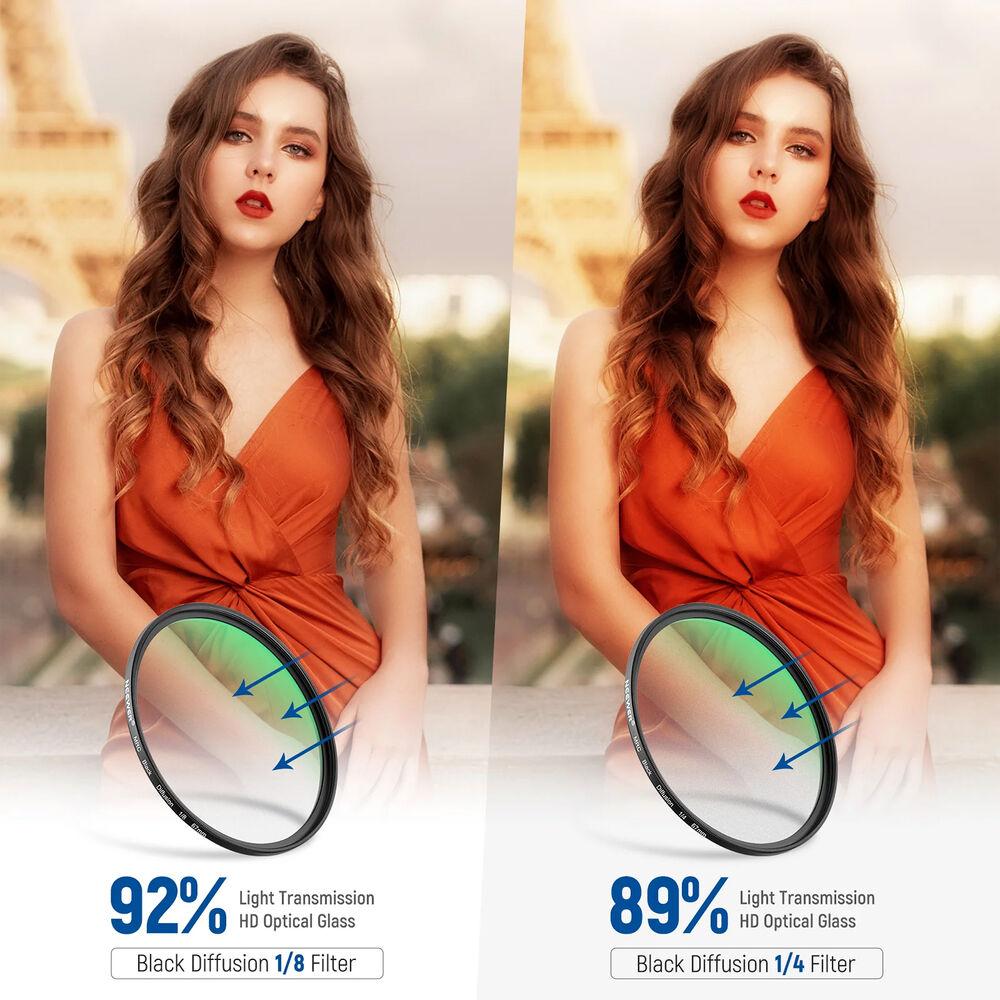 комплект из 2 черных диффузионных фильтров Neewer создает кинематографические эффекты с плотностью 1/4 и 1/8. Фильтры помогают уменьшить блики и отблески, делая кожу более гладкой и придавая тон более размытый и мягкий вид. Благодаря мечтательным эффектам размытой пленки они идеально подходят для портретной фотографии и видеозаписи. Изготовленные из передового оптического HD стекла с превосходным светопропусканием, эти фильтры для объектива снижают контрастность, смягчают появление морщин и пор кожи, а также обеспечивают практичный и увеличенный ореол, который добавляет изображению приятную теплую глубину. 30 слоев нанопокрытия с обеих сторон фильтров делают их водонепроницаемыми, устойчивыми к царапинам и маслостойкими, что позволяет эффективно уменьшать отражение света со всех сторон и сам фильтр.